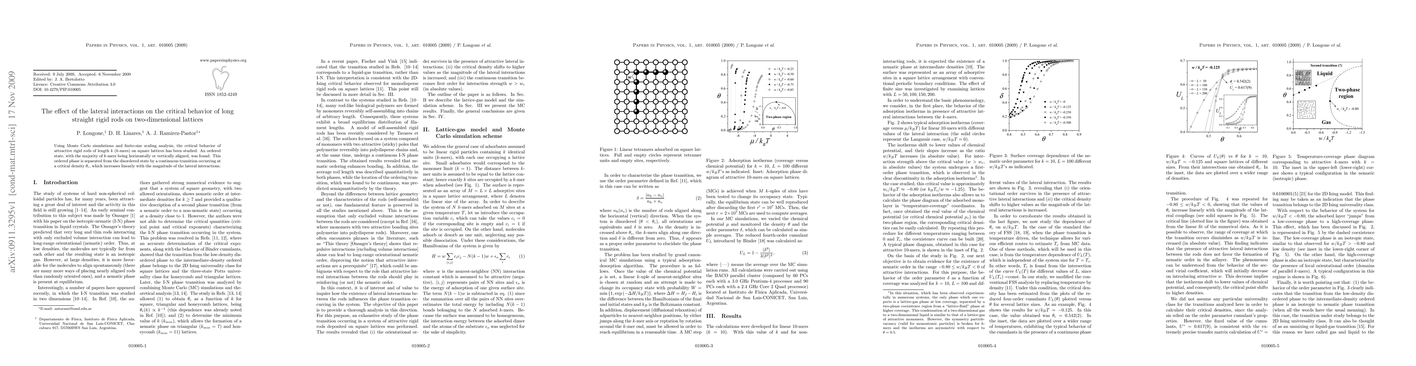 This study investigates the critical behavior of long, straight rigid rods on two-dimensional lattices using Monte Carlo simulations, revealing a nematic phase characterized by parallel rod alignments. The transition from isotropic to nematic phase occurs continuously at a density \theta_c that scales linearly with the strength of lateral interactions.