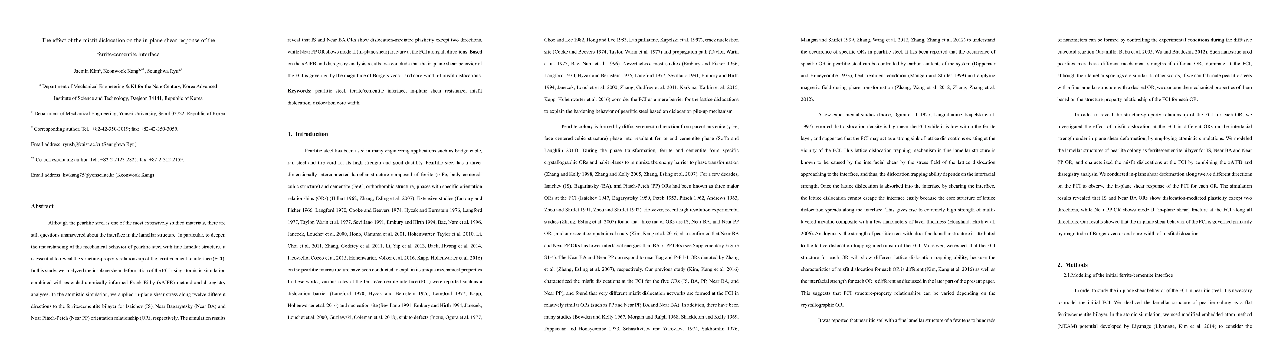 Although the pearlitic steel is one of the most extensively studied materials, there are still questions unanswered about the interface in the lamellar structure. In particular, to deepen the understanding of the mechanical behavior of pearlitic steel with fine lamellar structure, it is essential to reveal the structure-property relationship of the ferrite/cementite interface (FCI). In this study, we analyzed the in-plane shear deformation of the FCI using atomistic simulation combined with extended atomically informed Frank-Bilby (xAIFB) method and disregistry analyses. In the atomistic simulation, we applied in-plane shear stress along twelve different directions to the ferrite/cementite bilayer for Isaichev (IS), Near Bagaryatsky (Near BA) and Near Pitsch-Petch (Near PP) orientation relationship (OR), respectively. The simulation results reveal that IS and Near BA ORs show dislocation-mediated plasticity except two directions, while Near PP OR shows mode II (in-plane shear) fracture at the FCI along all directions. Based on the xAIFB and disregistry analysis results, we conclude that the in-plane shear behavior of the FCI is governed by the magnitude of Burgers vector and core-width of misfit dislocations.