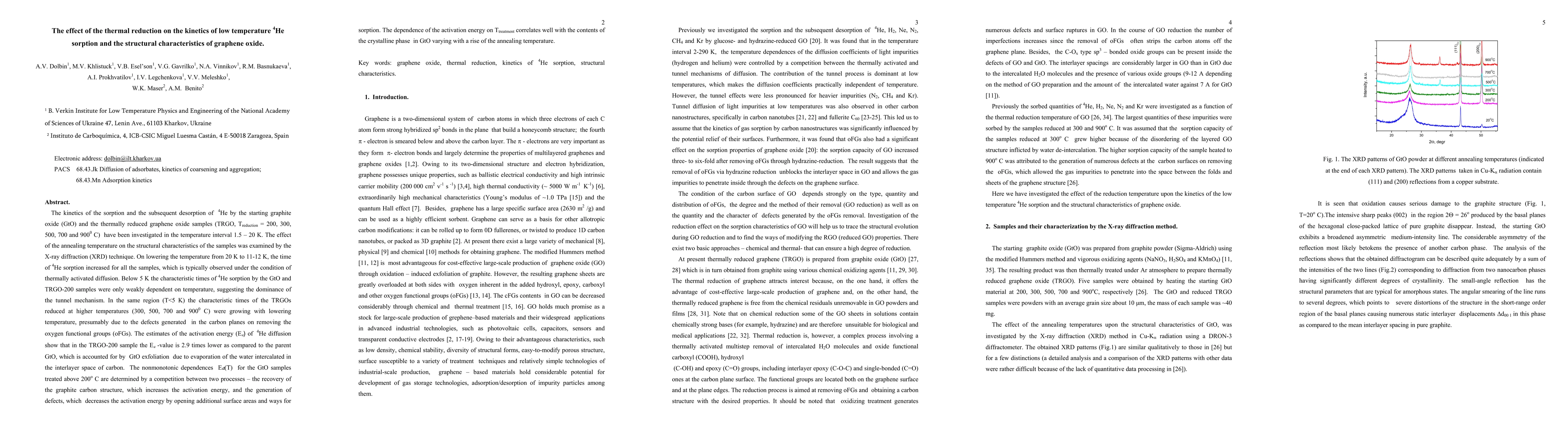 The kinetics of the sorption and the subsequent desorption of 4He by the starting graphite oxide (GtO) and the thermally reduced graphene oxide samples (TRGO, Treduction = 200, 300, 500, 700 and 900 C) have been investigated in the temperature interval 1.5 - 20 K. The effect of the annealing temperature on the structural characteristics of the samples was examined by the X-ray diffraction (XRD) technique. On lowering the temperature from 20 K to 11-12 K, the time of 4He sorption increased for all the samples, which is typically observed under the condition of thermally activated diffusion. Below 5 K the characteristic times of 4He sorption by the GtO and TRGO-200 samples were only weakly dependent on temperature, suggesting the dominance of the tunnel mechanism. In the same region (T<5 K) the characteristic times of the TRGOs reduced at higher temperatures (300, 500, 700 and 900 C) were growing with lowering temperature, presumably due to the defects generated in the carbon planes on removing the oxygen functional groups (oFGs). The estimates of the activation energy (Ea) of 4He diffusion show that in the TRGO-200 sample the Ea value is 2.9 times lower as compared to the parent GtO, which is accounted for by GtO exfoliation due to evaporation of the water intercalated in the interlayer space of carbon. The nonmonotonic dependences Ea vs T for the GtO samples treated above 200 C are determined by a competition between two processes - the recovery of the graphite carbon structure, which increases the activation energy, and the generation of defects, which decreases the activation energy by opening additional surface areas and ways for sorption. The dependence of the activation energy on treatment temperature correlates well with the contents of the crystalline phase in GtO varying with a rise of the annealing temperature.