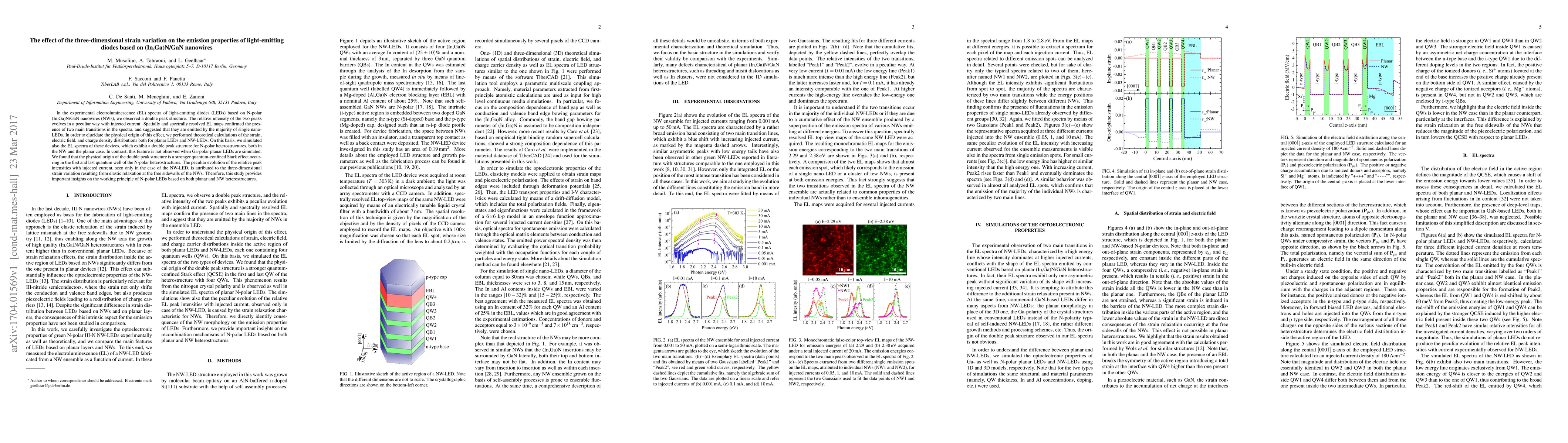 This study investigates the double peak structure in the electroluminescence spectra of N-polar (In,Ga)N/GaN nanowire LEDs, attributing the phenomenon to a stronger quantum-confined Stark effect. The unique evolution of peak intensities with current is linked to three-dimensional strain variations due to elastic relaxation at the nanowire sidewalls.