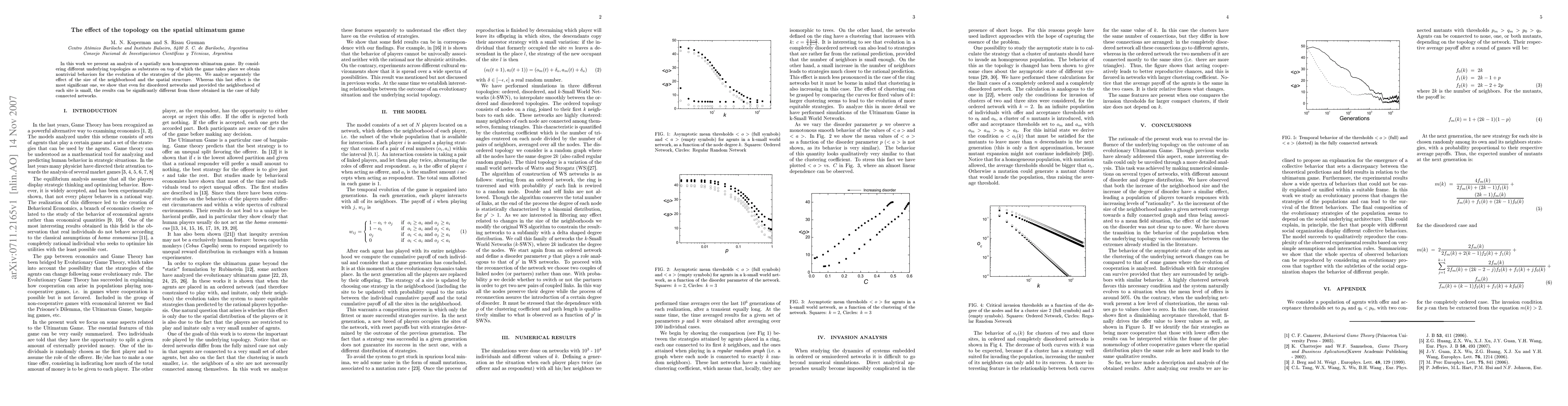 This research investigates how different spatial topologies influence the outcomes of a spatially non-homogeneous ultimatum game, revealing that the spatial structure significantly affects strategy evolution, with small neighborhood sizes in disordered networks yielding results distinct from fully connected networks.