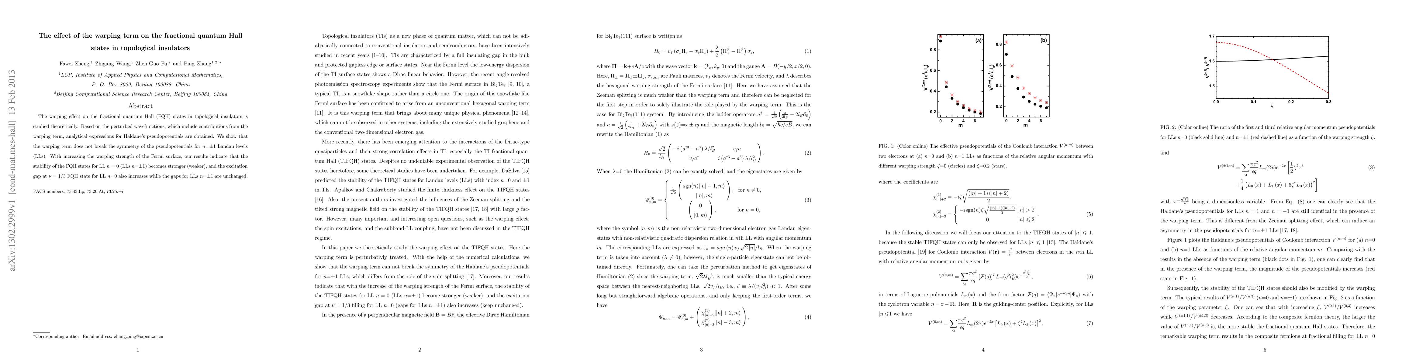 This study theoretically investigates the warping effect on fractional quantum Hall states in topological insulators, deriving analytical expressions for Haldane's pseudopotentials that include warping contributions. It finds that the warping term maintains symmetry for Landau levels $n=\pm1$, while increasing warping strength enhances stability for $n=0$ and maintains gap stability for $n=\pm1$.