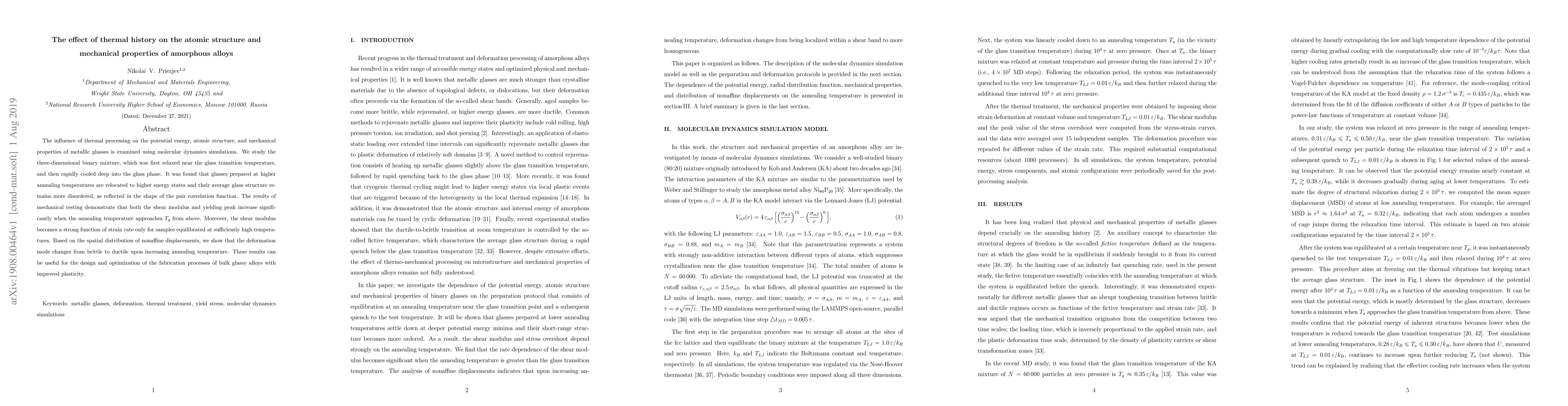 This study uses molecular dynamics simulations to investigate the impact of thermal history on the atomic structure and mechanical properties of amorphous alloys. Higher annealing temperatures lead to more disordered atomic structures and increased mechanical strength, with a transition from brittle to ductile deformation modes.