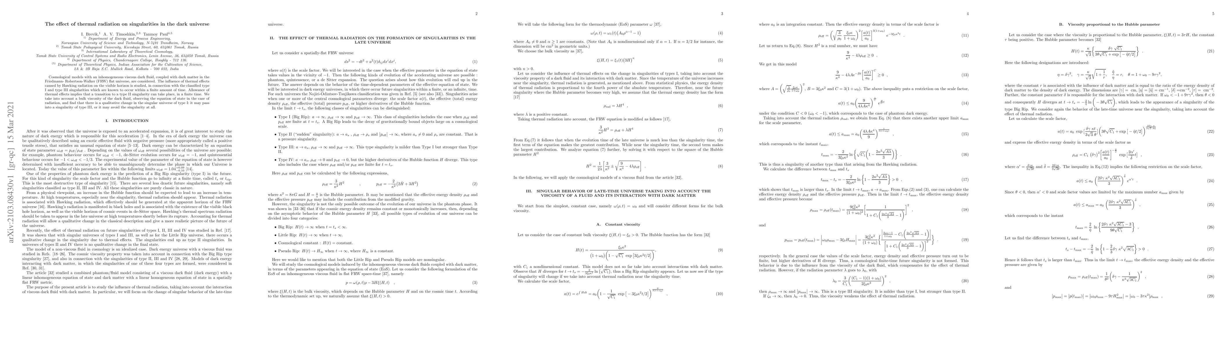 Cosmological models with an inhomogeneous viscous dark fluid, coupled with dark matter in the Friedmann- Robertson-Walker (FRW) flat universe, are considered. The influence of thermal effects caused by Hawking radiation on the visible horizon is studied, in connection with the classified type I and type III singularities which are known to occur within a finite amount of time. Allowance of thermal effects implies that a transition to a type II singularity can take place, in a finite time. We take into account a bulk viscosity of the dark fluid, observing the equation of state in the case of radiation, and find that there is a qualitative change in the singular universe of type I: it may pass into a singularity of type III, or it may avoid the singularity at all.