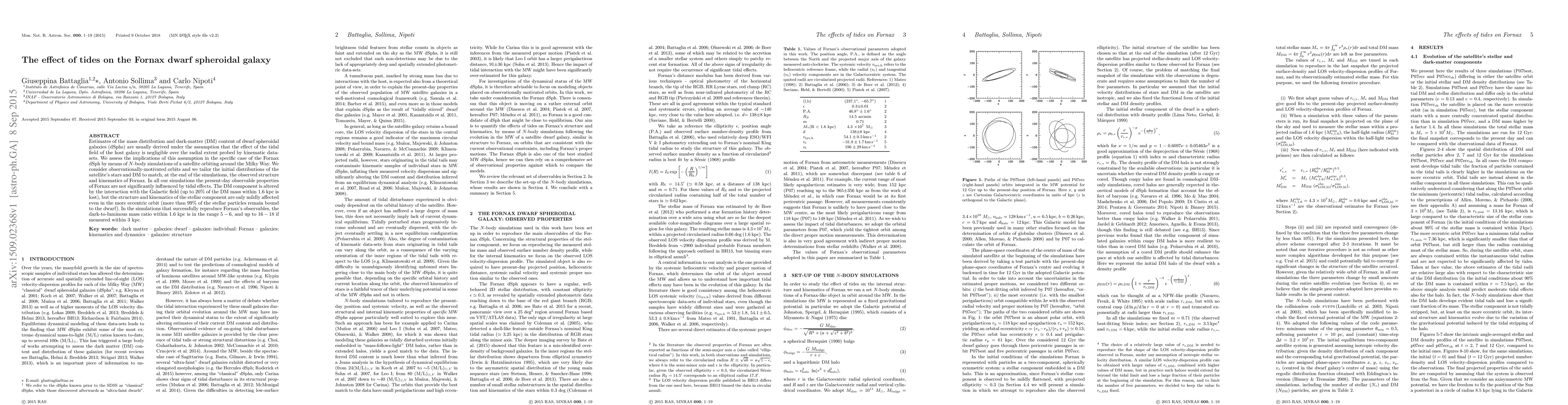 This study uses N-body simulations to determine the impact of tidal forces from the Milky Way on the Fornax dwarf spheroidal galaxy, finding that while the dark matter mass is significantly affected (up to 20% loss within 1.6 kpc), the stellar structure and kinematics remain largely intact, with over 99% of stars remaining bound. The dark-to-luminous mass ratio is estimated to be 5-6 within 1.6 kpc.