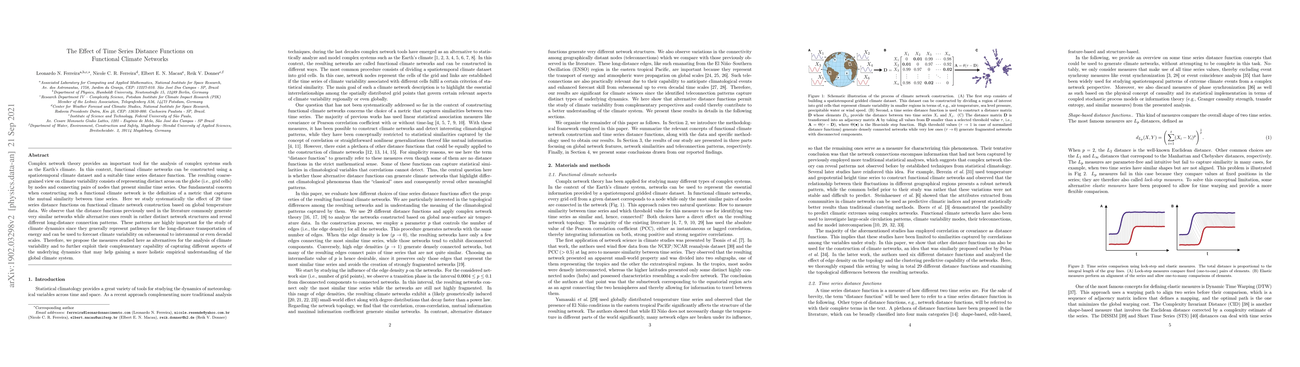 This study systematically examines the impact of 29 time series distance functions on functional climate networks using global temperature data. It reveals that while commonly used distance functions generate similar networks, others produce distinct structures with unique long-distance connection patterns, crucial for understanding climate dynamics and forecasting climate variability.
