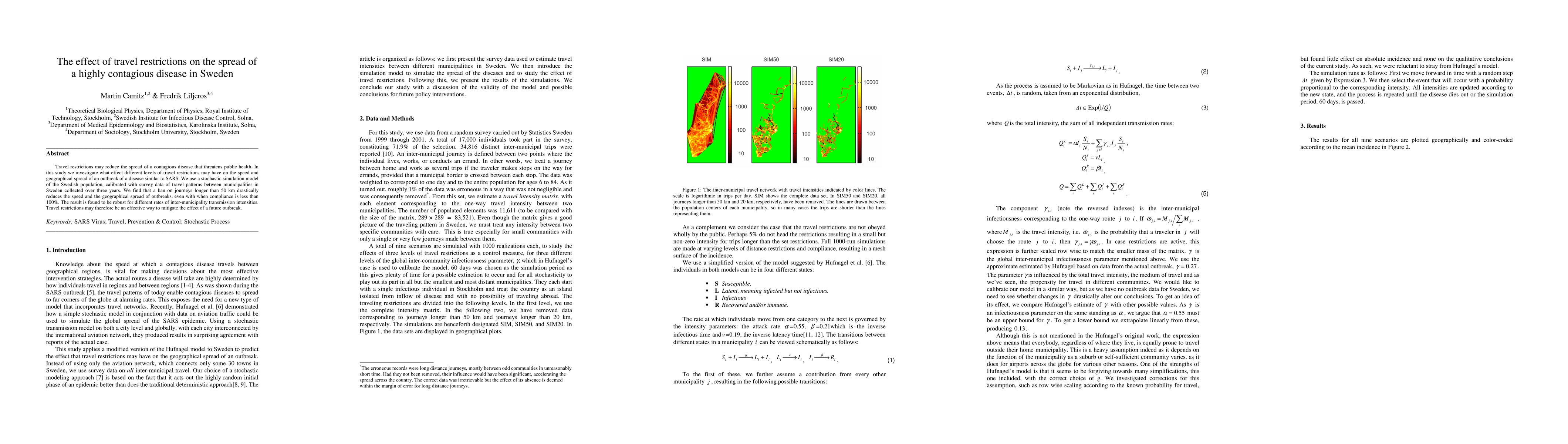 Travel restrictions reduced the speed and geographical spread of a disease outbreak in Sweden, even with low compliance rates. This finding suggests that travel restrictions can be an effective way to mitigate the effects of a future outbreak.