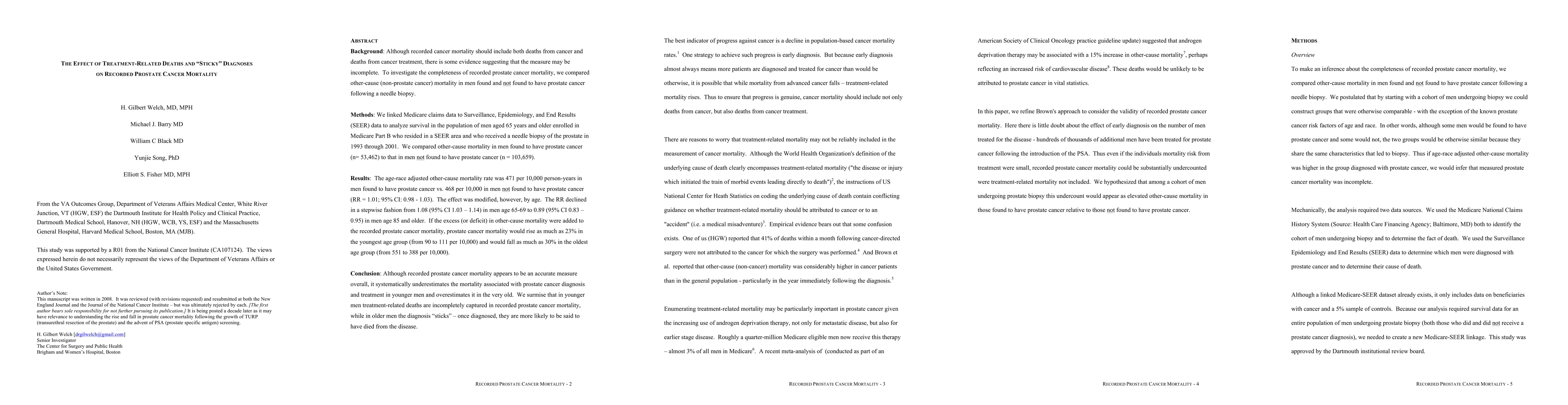 Background: Although recorded cancer mortality should include both deaths from cancer and deaths from cancer treatment, there is evidence suggesting that the measure may be incomplete. To investigate the completeness of recorded prostate cancer mortality, we compared other-cause (non-prostate cancer) mortality in men found and not found to have prostate cancer following a needle biopsy. Methods: We linked Medicare claims data to SEER data to analyze survival in the population of men aged 65+ enrolled in Medicare who resided in a SEER area and received a needle biopsy in 1993-2001. We compared other-cause mortality in men found to have prostate cancer (n=53,462) to that in men not found to have prostate cancer (n=103,659). Results: The age-race adjusted other-cause mortality rate was 471 per 10,000 person-years in men found to have prostate cancer vs. 468 per 10,000 in men not found to have prostate cancer (RR = 1.01;95% CI:0.98-1.03). The effect was modified, however, by age. The RR declined in a stepwise fashion from 1.08 (95% CI:1.03-1.14) in men age 65-69 to 0.89 (95% CI:0.83-0.95) in men age 85 and older. If the excess (or deficit) in other-cause mortality were added to the recorded prostate cancer mortality, prostate cancer mortality would rise 23% in the youngest age group (from 90 to 111 per 10,000) and would fall 30% in the oldest age group (from 551 to 388 per 10,000). Conclusion: Although recorded prostate cancer mortality appears to be an accurate measure overall, it systematically underestimates the mortality associated with prostate cancer diagnosis and treatment in younger men and overestimates it in the very old. We surmise that in younger men treatment-related deaths are incompletely captured in recorded prostate cancer mortality, while in older men the diagnosis "sticks"-- once diagnosed, they are more likely to be said to have died from the disease.