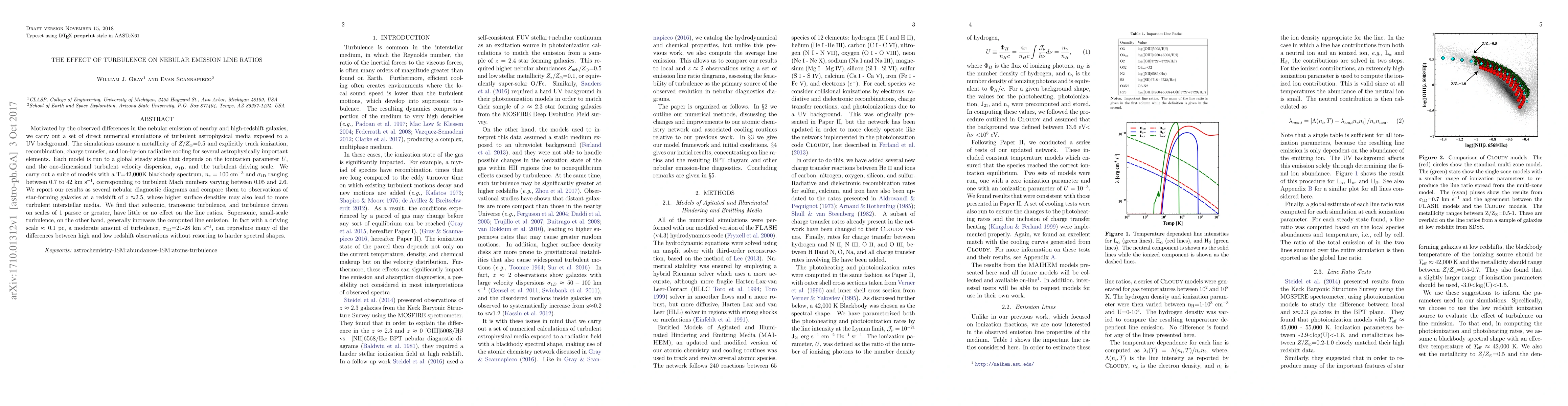 Motivated by the observed differences in the nebular emission of nearby and high-redshift galaxies, we carry out a set of direct numerical simulations of turbulent astrophysical media exposed to a UV background. The simulations assume a metallicity of $Z/Z_{\odot}$=0.5 and explicitly track ionization, recombination, charge transfer, and ion-by-ion radiative cooling for several astrophysically important elements. Each model is run to a global steady state that depends on the ionization parameter $U$, and the one-dimensional turbulent velocity dispersion, $\sigma_{\rm 1D}$, and the turbulent driving scale. We carry out a suite of models with a T=42,000K blackbody spectrum, $n_e$ = 100 cm$^{-3}$ and $\sigma_{\rm 1D}$ ranging between 0.7 to 42 km s$^{-1},$ corresponding to turbulent Mach numbers varying between 0.05 and 2.6. We report our results as several nebular diagnostic diagrams and compare them to observations of star-forming galaxies at a redshift of $z\approx$2.5, whose higher surface densities may also lead to more turbulent interstellar media. We find that subsonic, transsonic turbulence, and turbulence driven on scales of 1 parsec or greater, have little or no effect on the line ratios. Supersonic, small-scale turbulence, on the other hand, generally increases the computed line emission. In fact with a driving scale $\approx 0.1$ pc, a moderate amount of turbulence, $\sigma_{\rm 1D}$=21-28 km s$^{-1},$ can reproduce many of the differences between high and low redshift observations without resorting to harder spectral shapes.