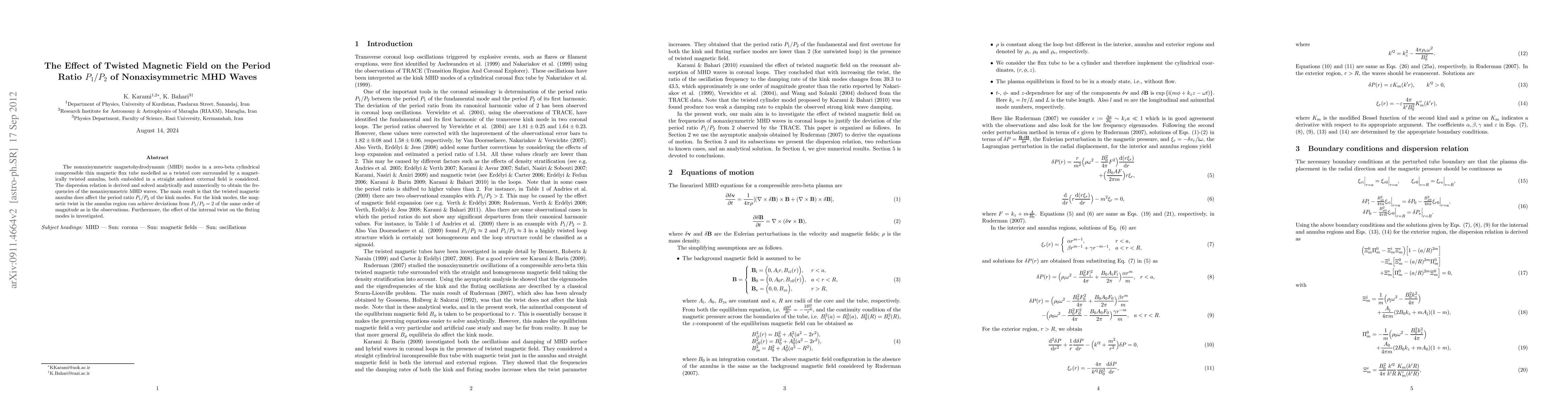 Researchers studied how a twisted magnetic field affects the period ratio of nonaxisymmetric MHD waves in a specific magnetohydrodynamic model, finding that the twist can alter this ratio, potentially affecting observations.