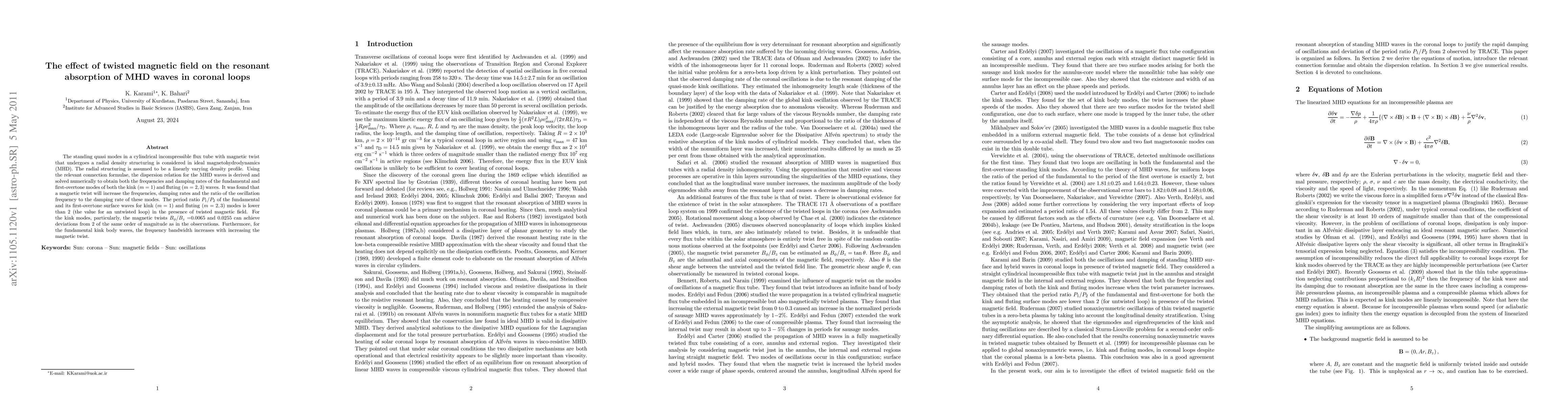 The standing quasi modes in a cylindrical incompressible flux tube with magnetic twist that undergoes a radial density structuring is considered in ideal magnetohydrodynamics (MHD). The radial structuring is assumed to be a linearly varying density profile. Using the relevant connection formulae, the dispersion relation for the MHD waves is derived and solved numerically to obtain both the frequencies and damping rates of the fundamental and first-overtone modes of both the kink (m=1) and fluting (m=2,3) waves. It was found that a magnetic twist will increase the frequencies, damping rates and the ratio of the oscillation frequency to the damping rate of these modes. The period ratio P_1/P_2 of the fundamental and its first-overtone surface waves for kink (m=1) and fluting (m=2,3) modes is lower than 2 (the value for an untwisted loop) in the presence of twisted magnetic field. For the kink modes, particularly, the magnetic twists B_{\phi}/B_z=0.0065 and 0.0255 can achieve deviations from 2 of the same order of magnitude as in the observations. Furthermore, for the fundamental kink body waves, the frequency bandwidth increases with increasing the magnetic twist.