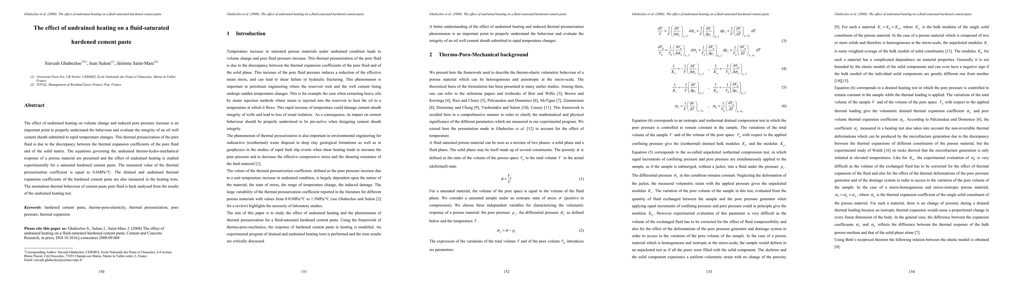 The effect of undrained heating on volume change and induced pore pressure increase is an important point to properly understand the behaviour and evaluate the integrity of an oil well cement sheath submitted to rapid temperature changes. This thermal pressurization of the pore fluid is due to the discrepancy between the thermal expansion coefficients of the pore fluid and of the solid matrix. The equations governing the undrained thermo-hydro-mechanical response of a porous material are presented and the effect of undrained heating is studied experimentally for a saturated hardened cement paste. The measured value of the thermal pressurization coefficient is equal to 0.6MPa/°C. The drained and undrained thermal expansion coefficients of the hardened cement paste are also measured in the heating tests. The anomalous thermal behaviour of cement pore fluid is back analysed from the results of the undrained heating test.