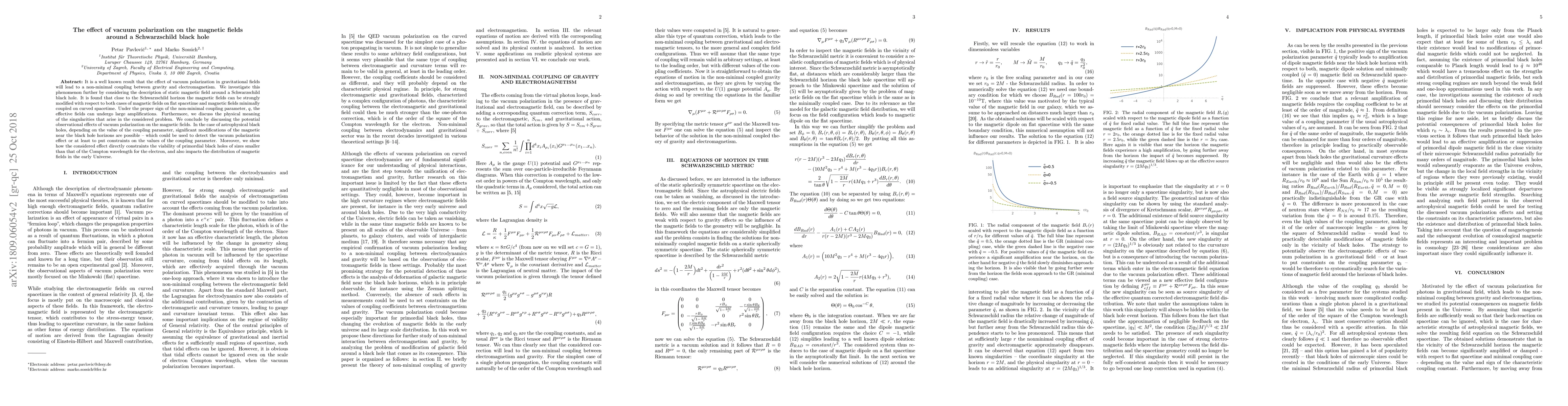 It is a well known result that the effect of vacuum polarization in gravitational fields will lead to a non-minimal coupling between gravity and electromagnetism. We investigate this phenomenon further by considering the description of static magnetic field around a Schwarzschild black hole. It is found that close to the Schwarzschild horizon the magnetic fields can be strongly modified with respect to both cases of magnetic fields on flat spacetime and magnetic fields minimally coupled on curved spacetime. Under the proper sign of the non-minimal coupling parameter, $q$, the effective fields can undergo large amplifications. Furthermore, we discuss the physical meaning of the singularities that arise in the considered problem. We conclude by discussing the potential observational effects of vacuum polarization on the magnetic fields. In the case of astrophysical black holes, depending on the value of the coupling parameter, significant modifications of the magnetic near the black hole horizons are possible -- which could be used to detect the vacuum polarization effect or at least to put constraints on the values of the coupling parameter. Moreover, we show how the considered effect directly constraints the viability of primordial black holes of sizes smaller than that of the Compton wavelength for the electron, and also impacts the distribution of magnetic fields in the early Universe.
