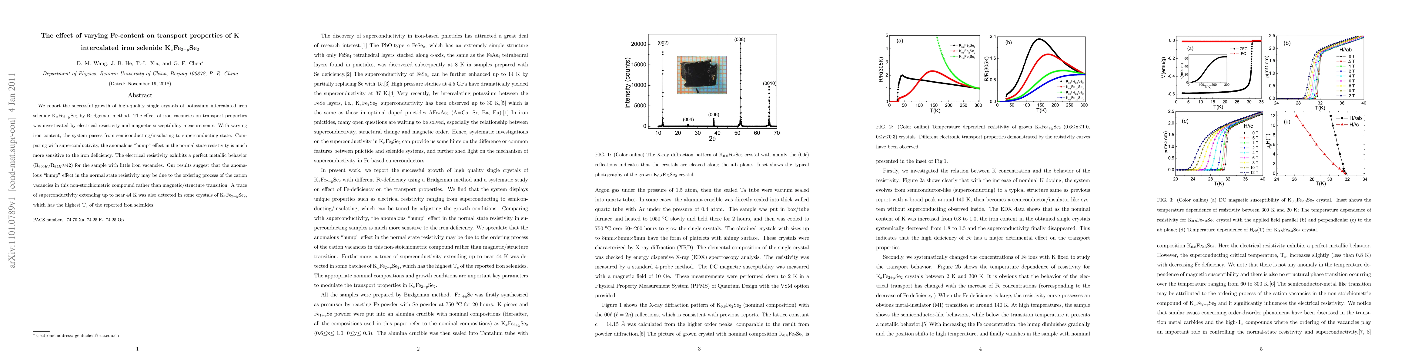 This study investigates the transport properties of KxFe2-ySe2 single crystals, revealing that iron vacancies induce a transition from semiconducting to superconducting behavior. The "hump" effect in resistivity is linked to cation vacancy ordering rather than magnetic/structural changes.