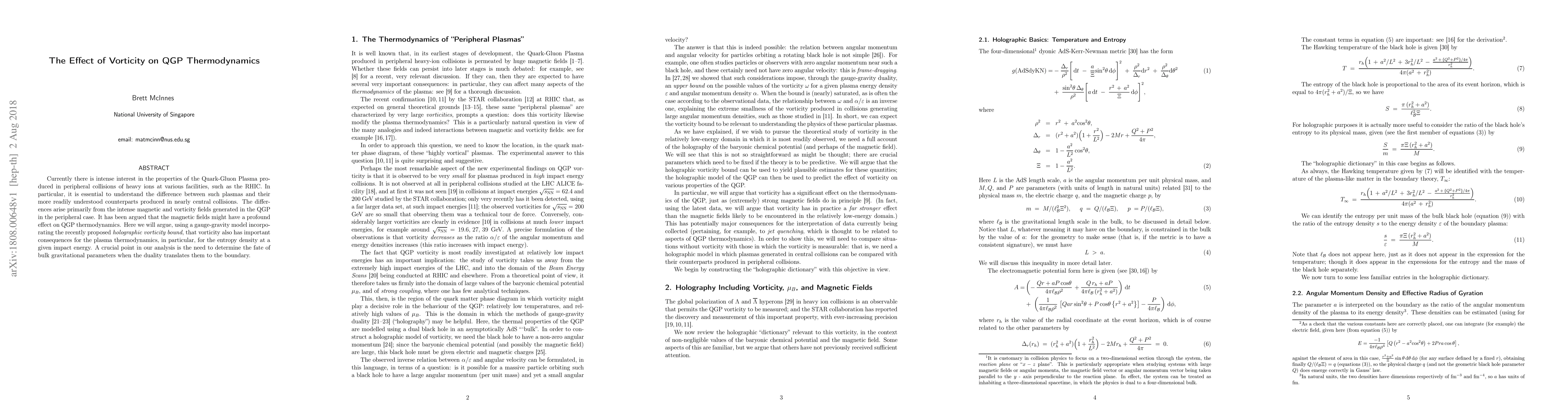 Currently there is intense interest in the properties of the Quark-Gluon Plasma produced in peripheral collisions of heavy ions at various facilities, such as the RHIC. In particular, it is essential to understand the difference between such plasmas and their more readily understood counterparts produced in nearly central collisions. The differences arise primarily from the intense magnetic and vorticity fields generated in the QGP in the peripheral case. It has been argued that the magnetic fields might have a profound effect on QGP thermodynamics. Here we will argue, using a gauge-gravity model incorporating the recently proposed holographic vorticity bound, that vorticity also has important consequences for the plasma thermodynamics, in particular, for the entropy density at a given impact energy. A crucial point in our analysis is the need to determine the fate of bulk gravitational parameters when the duality translates them to the boundary.