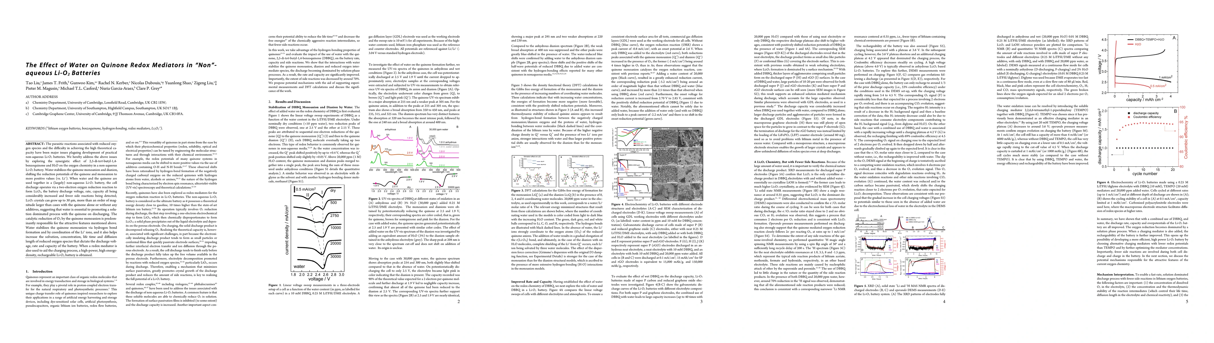 This paper investigates how water and quinone redox mediators enhance the performance of non-aqueous Li-O2 batteries by stabilizing quinone intermediates and promoting a two-electron oxygen reduction reaction, resulting in higher discharge voltage, rate, and capacity with fewer side reactions.