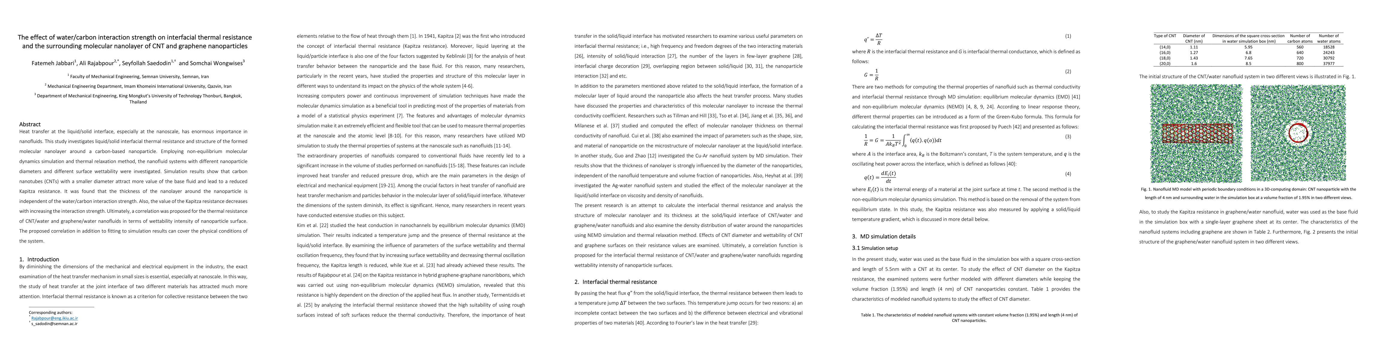 This study uses molecular dynamics simulations to explore how water/carbon interaction strength affects interfacial thermal resistance and the molecular nanolayer around carbon-based nanoparticles. Results show that smaller diameter CNTs reduce Kapitza resistance and that the interaction strength inversely correlates with thermal resistance, while the nanolayer thickness remains unaffected by this strength.