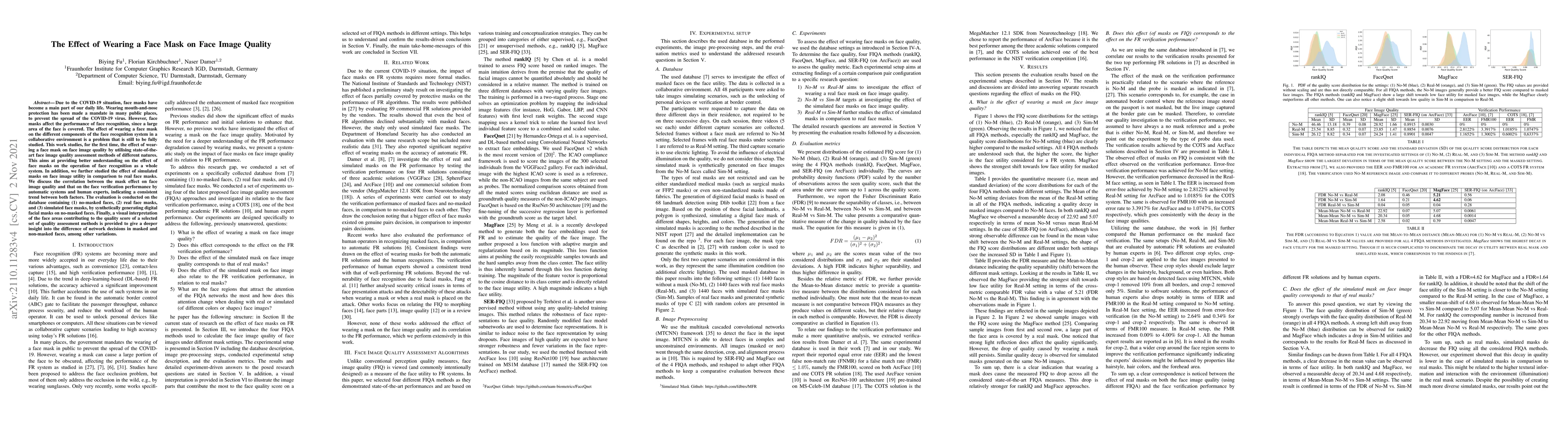 This study investigates the impact of face masks on face image quality using advanced assessment methods, revealing significant degradation in image quality due to mask coverage. The research also correlates these effects with both automatic system and human expert face verification performance, showing consistent trends.
