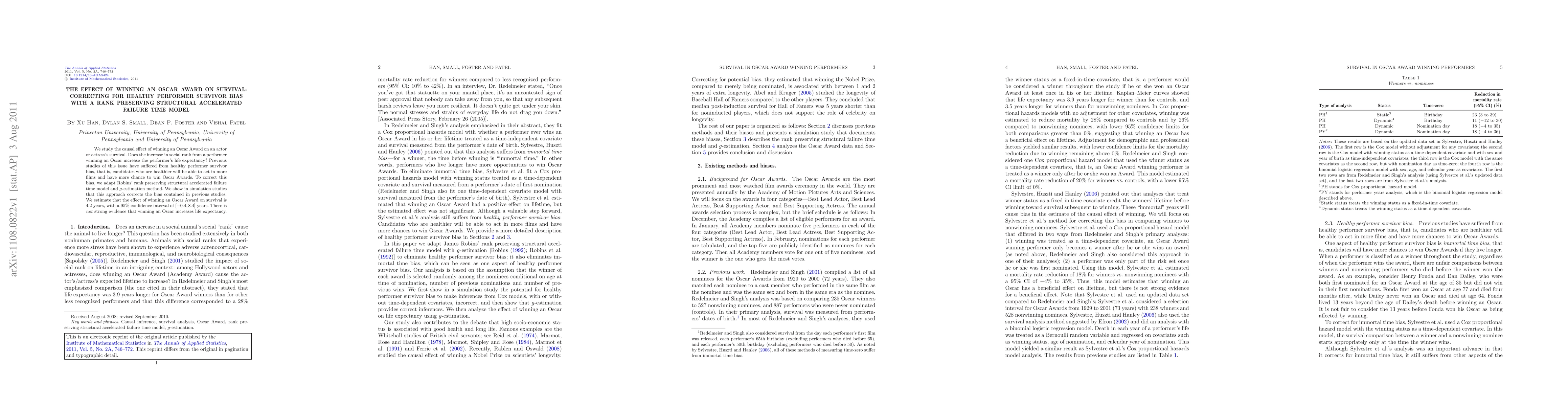 We study the causal effect of winning an Oscar Award on an actor or actress's survival. Does the increase in social rank from a performer winning an Oscar increase the performer's life expectancy? Previous studies of this issue have suffered from healthy performer survivor bias, that is, candidates who are healthier will be able to act in more films and have more chance to win Oscar Awards. To correct this bias, we adapt Robins' rank preserving structural accelerated failure time model and $g$-estimation method. We show in simulation studies that this approach corrects the bias contained in previous studies. We estimate that the effect of winning an Oscar Award on survival is 4.2 years, with a 95% confidence interval of $[-0.4,8.4]$ years. There is not strong evidence that winning an Oscar increases life expectancy.
