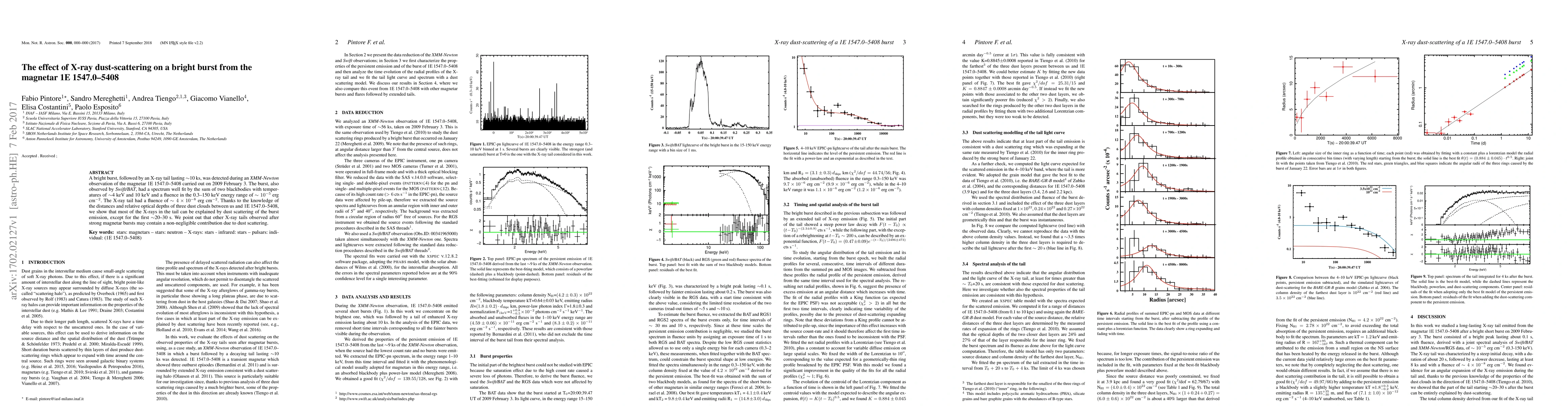 A bright burst, followed by an X-ray tail lasting ~10 ks, was detected during an XMM-Newton observation of the magnetar 1E 1547.0-5408 carried out on 2009 February 3. The burst, also observed by SWIFT/BAT, had a spectrum well fit by the sum of two blackbodies with temperatures of ~4 keV and 10 keV and a fluence in the 0.3-150 keV energy range of ~1e-5 erg/cm2. The X-ray tail had a fluence of ~4e-8 erg/cm2. Thanks to the knowledge of the distances and relative optical depths of three dust clouds between us and 1E 1547.0-5408, we show that most of the X-rays in the tail can be explained by dust scattering of the burst emission, except for the first ~20-30 s. We point out that other X-ray tails observed after strong magnetar bursts may contain a non-negligible contribution due to dust scattering.