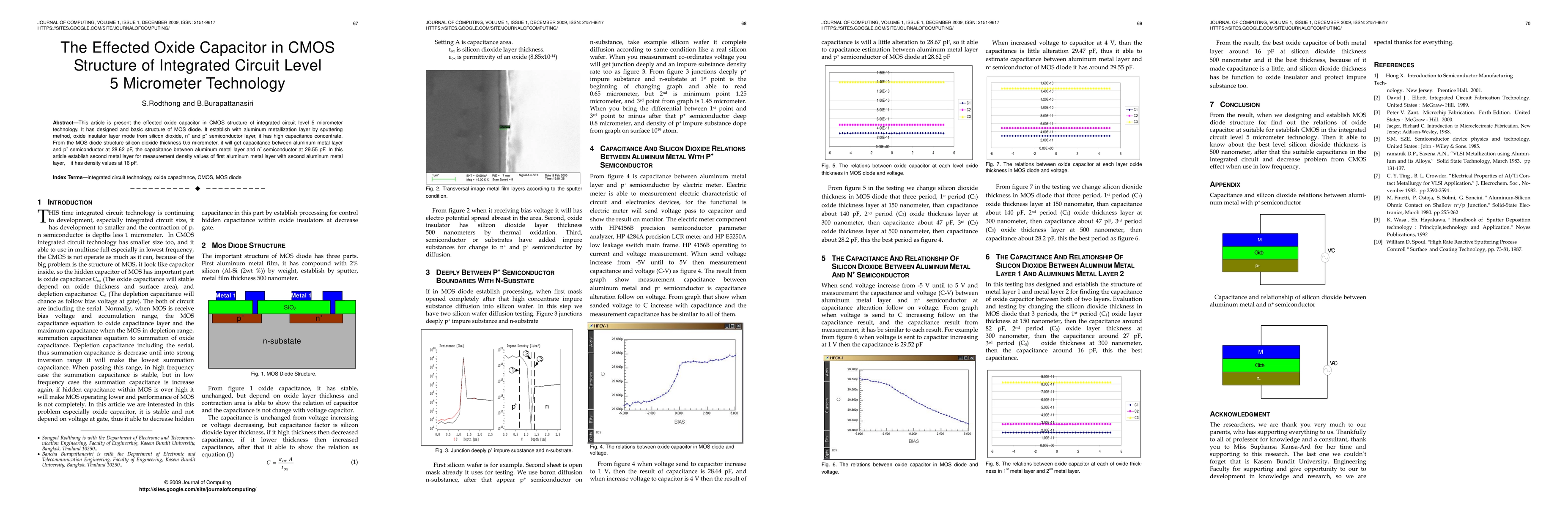 This paper investigates the capacitance characteristics of an oxide capacitor in a CMOS structure using 5 micrometer technology. It details the design of a MOS diode with an aluminum metallization layer, a silicon dioxide insulator layer, and n+ and p+ semiconductor layers, achieving a high capacitance density of 28.62 pF and 29.55 pF respectively.