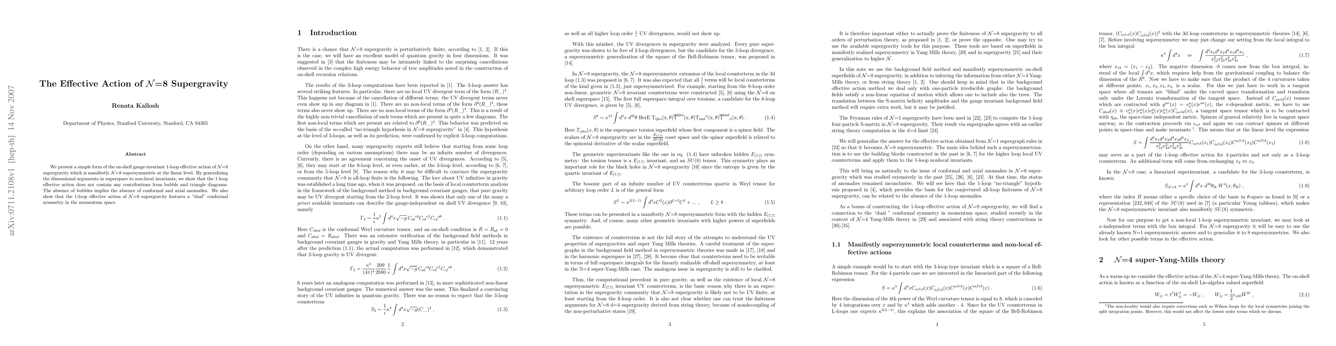 This paper derives the 1-loop effective action for N=8 supergravity, proving its N=8 supersymmetric nature and demonstrating no contributions from bubble or triangle diagrams, thereby eliminating conformal and axial anomalies, while also introducing a dual conformal symmetry in momentum space.