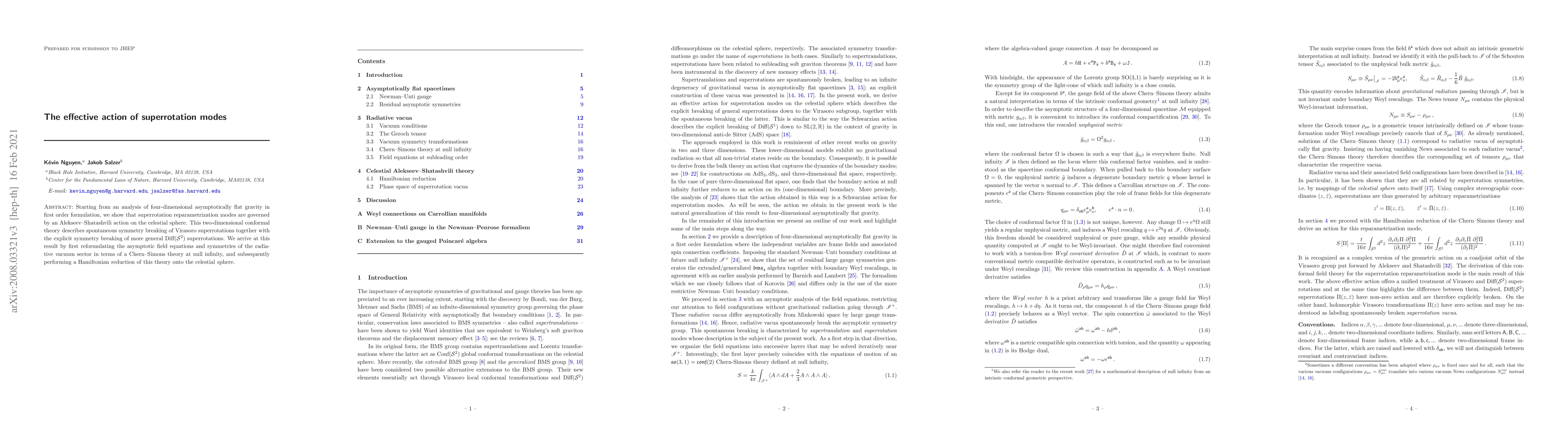 Starting from an analysis of four-dimensional asymptotically flat gravity in first order formulation, we show that superrotation reparametrization modes are governed by an Alekseev--Shatashvili action on the celestial sphere. This two-dimensional conformal theory describes spontaneous symmetry breaking of Virasoro superrotations together with the explicit symmetry breaking of more general Diff$(\mathcal{S}^2)$ superrotations. We arrive at this result by first reformulating the asymptotic field equations and symmetries of the radiative vacuum sector in terms of a Chern--Simons theory at null infinity, and subsequently performing a Hamiltonian reduction of this theory onto the celestial sphere.