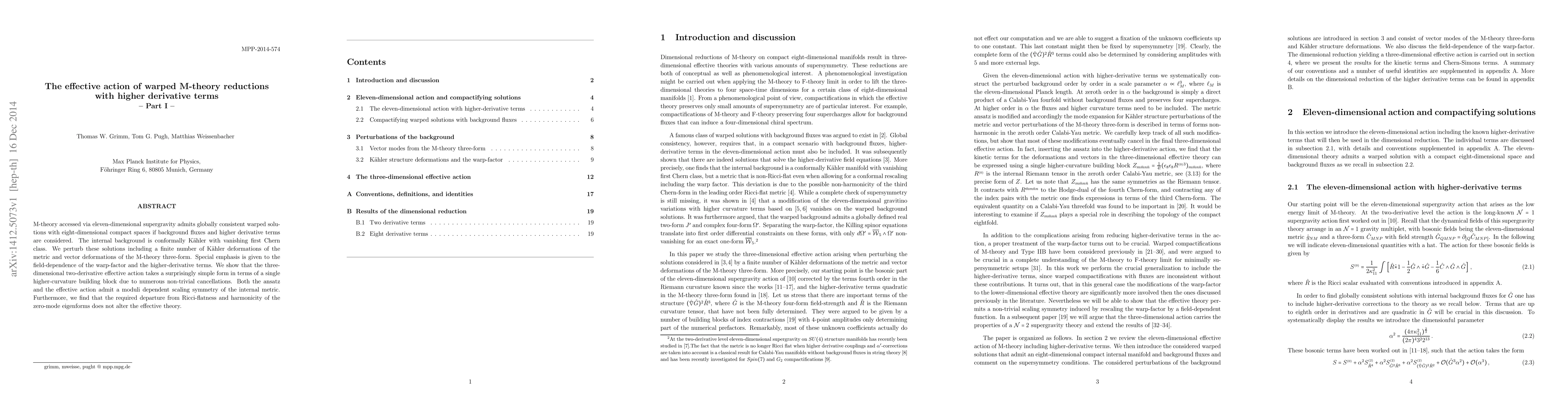 This paper explores warped solutions in M-theory, demonstrating how the inclusion of background fluxes and higher derivative terms allows for eight-dimensional compact spaces within eleven-dimensional supergravity. It reveals that the three-dimensional effective action simplifies significantly due to cancellations, maintaining a moduli dependent scaling symmetry and unaffected by deviations from Ricci-flatness and harmonicity.
