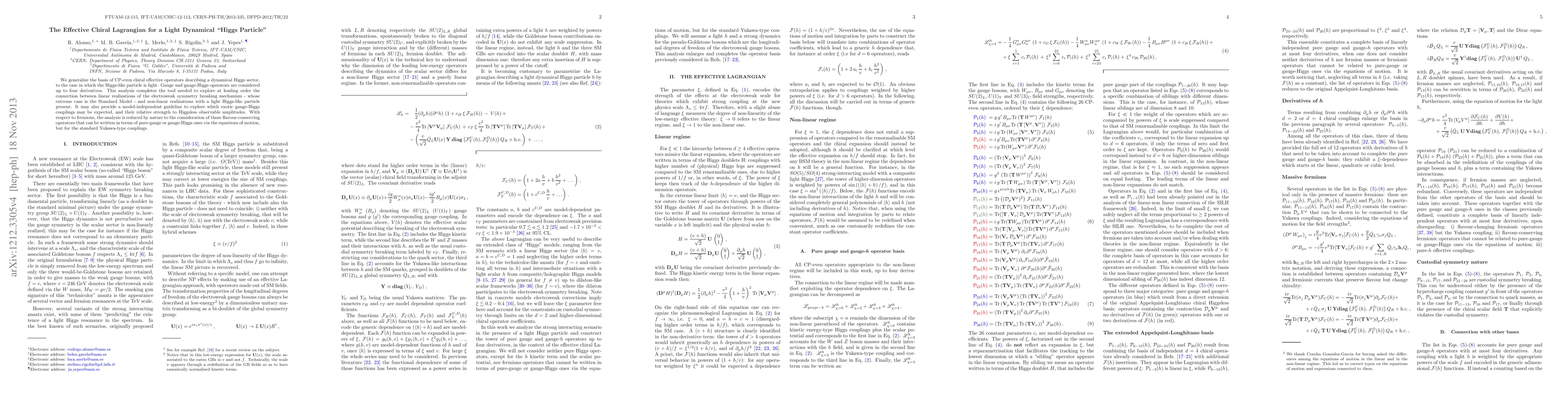We generalize the basis of CP-even chiral effective operators describing a dynamical Higgs sector, to the case in which the Higgs-like particle is light. Gauge and gauge-Higgs operators are considered up to mass dimension five. This analysis completes the tool needed to explore at leading order the connection between linear realizations of the electroweak symmetry breaking mechanism - whose extreme case is the Standard Model - and non-linear realizations with a light Higgs-like particle present. It may also provide a model-independent guideline to explore which exotic gauge-Higgs couplings may be expected, and their relative strength to Higgsless observable amplitudes. With respect to fermions, the analysis is reduced by nature to the consideration of those flavour-conserving operators that can be written in terms of pure-gauge or gauge-Higgs ones via the equations of motion, but for the standard Yukawa-type couplings.