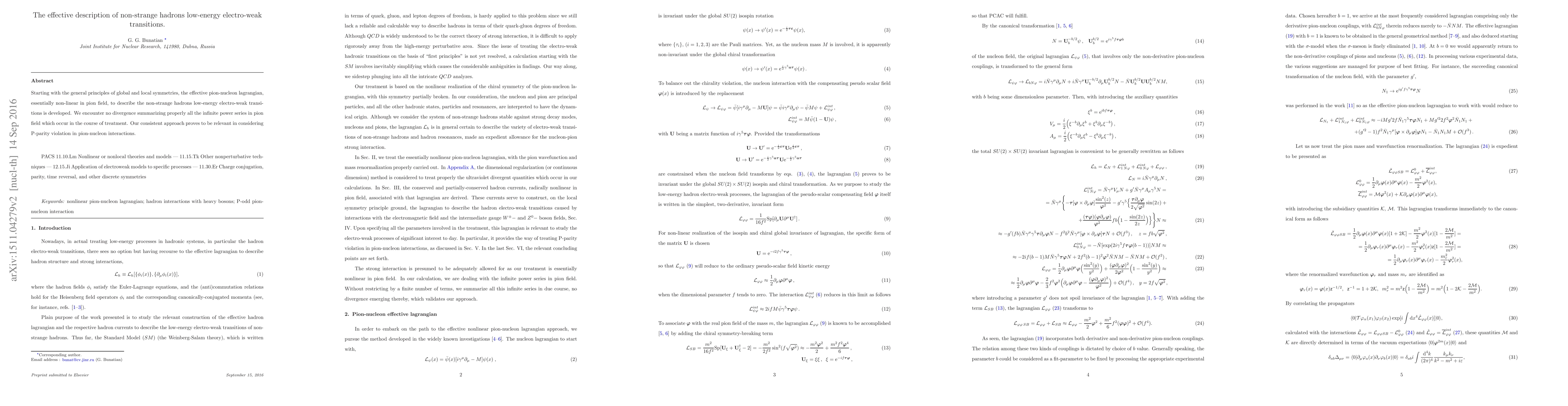 This paper develops an effective pion-nucleon Lagrangian to describe non-strange hadrons' low-energy electro-weak transitions, ensuring no divergences and summarizing infinite power series in pion fields. The approach is shown to be relevant for considering P-parity violation in pion-nucleon interactions.