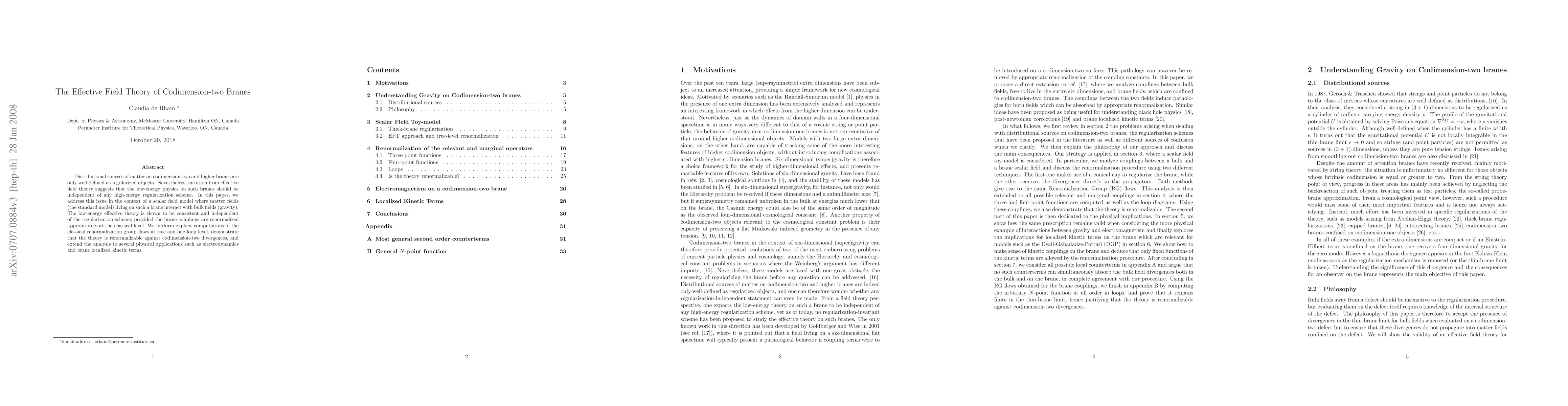 This paper explores the effective field theory of codimension-two branes, demonstrating that the low-energy physics remains regularization-independent when brane couplings are properly renormalized. It shows the consistency of the effective theory through classical renormalization group computations and applies the findings to physical scenarios like electrodynamics and brane kinetic terms.