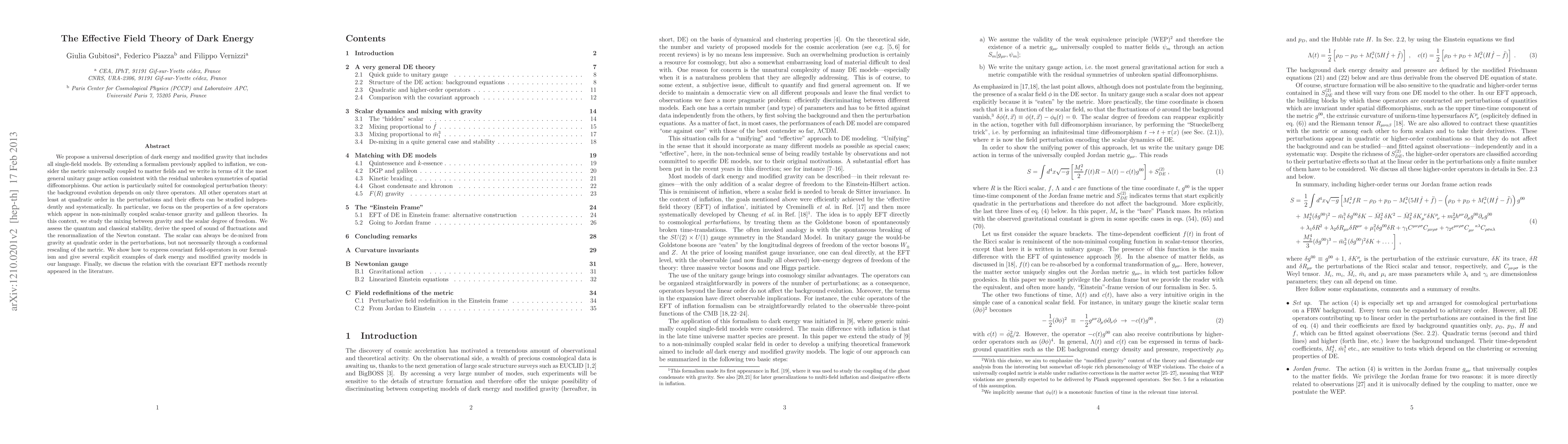 We propose a universal description of dark energy and modified gravity that includes all single-field models. By extending a formalism previously applied to inflation, we consider the metric universally coupled to matter fields and we write in terms of it the most general unitary gauge action consistent with the residual unbroken symmetries of spatial diffeomorphisms. Our action is particularly suited for cosmological perturbation theory: the background evolution depends on only three operators. All other operators start at least at quadratic order in the perturbations and their effects can be studied independently and systematically. In particular, we focus on the properties of a few operators which appear in non-minimally coupled scalar-tensor gravity and galileon theories. In this context, we study the mixing between gravity and the scalar degree of freedom. We assess the quantum and classical stability, derive the speed of sound of fluctuations and the renormalization of the Newton constant. The scalar can always be de-mixed from gravity at quadratic order in the perturbations, but not necessarily through a conformal rescaling of the metric. We show how to express covariant field-operators in our formalism and give several explicit examples of dark energy and modified gravity models in our language. Finally, we discuss the relation with the covariant EFT methods recently appeared in the literature.