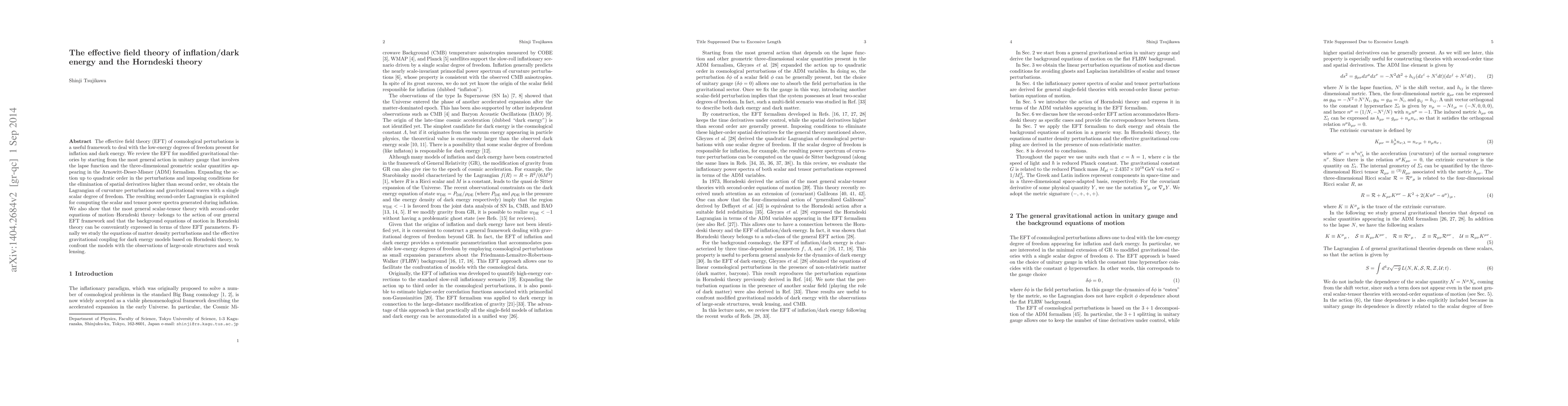 This paper reviews the effective field theory (EFT) framework for cosmological perturbations, focusing on inflation and dark energy. It demonstrates that the Horndeski theory, a general scalar-tensor theory with second-order equations of motion, fits within the EFT framework, allowing for the computation of scalar and tensor power spectra and the study of matter density perturbations and dark energy models.