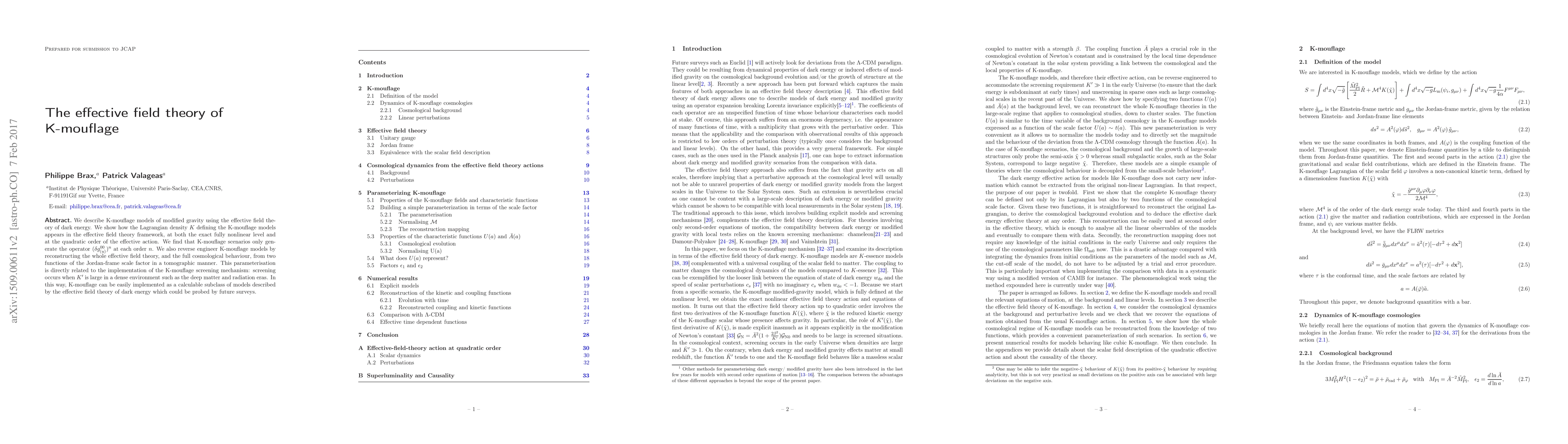 This paper explores K-mouflage models of modified gravity within the effective field theory of dark energy, demonstrating their appearance at both nonlinear and quadratic levels. It reveals that K-mouflage generates specific operators and reconstructs the full cosmological behavior through a tomographic parameterization, highlighting its screening mechanism in dense environments.