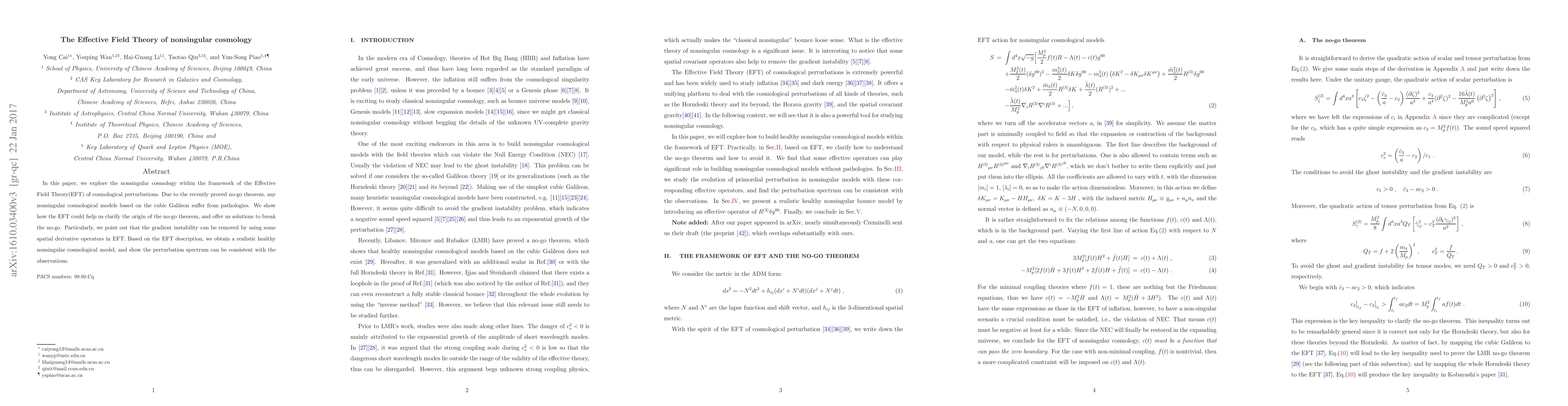 This paper utilizes the Effective Field Theory (EFT) framework to develop a nonsingular cosmological model, addressing the no-go theorem that plagues cubic Galileon models. By incorporating spatial derivative operators, the EFT resolves gradient instability and provides a viable, observationally consistent nonsingular cosmology.