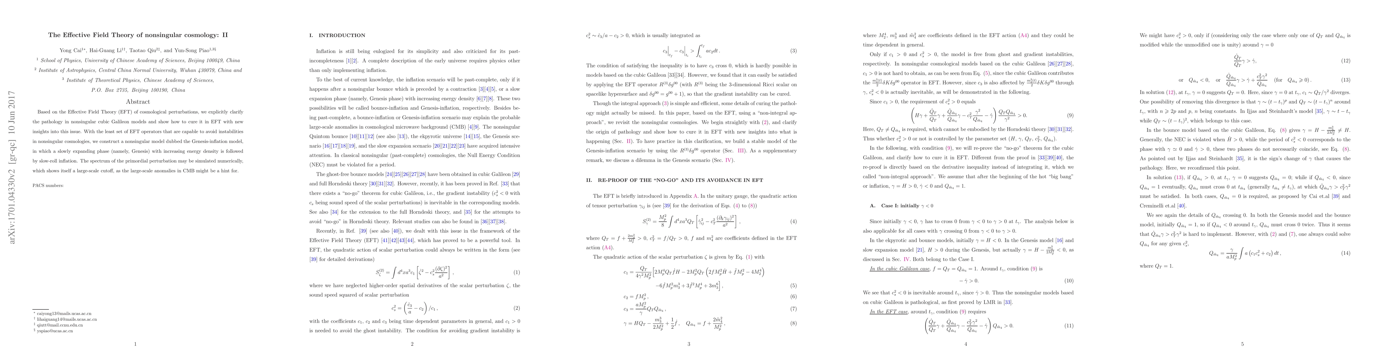 Based on the Effective Field Theory (EFT) of cosmological perturbations, we explicitly clarify the pathology in nonsingular cubic Galileon models and show how to cure it in EFT with new insights into this issue. With the least set of EFT operators that are capable to avoid instabilities in nonsingular cosmologies, we construct a nonsingular model dubbed the Genesis-inflation model, in which a slowly expanding phase (namely, Genesis) with increasing energy density is followed by slow-roll inflation. The spectrum of the primordial perturbation may be simulated numerically, which shows itself a large-scale cutoff, as the large-scale anomalies in CMB might be a hint for.