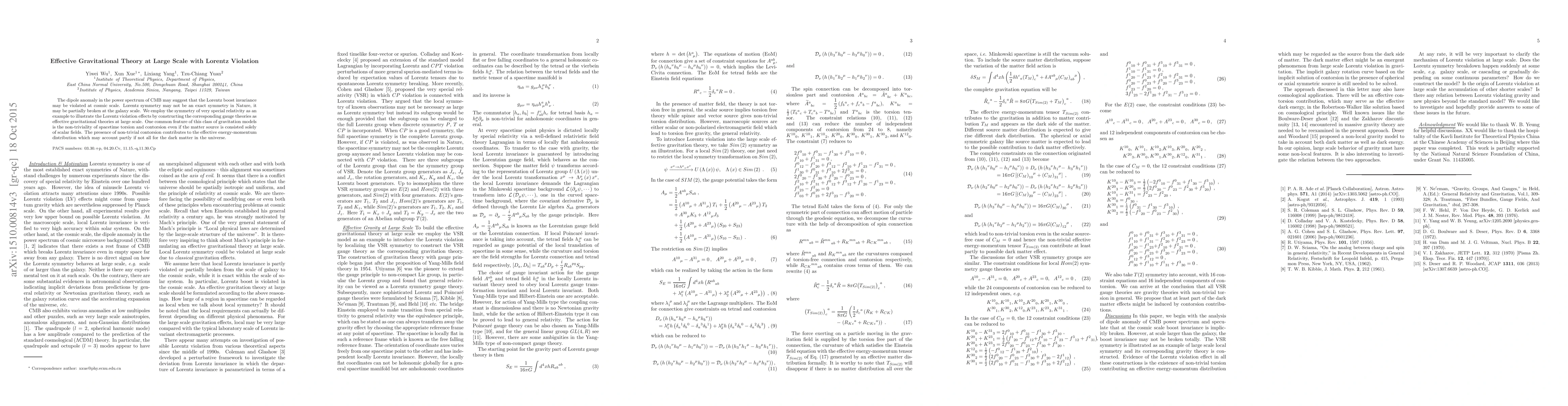 The dipole anomaly in the power spectrum of CMB may indicate that the Lorentz boost invarianc is violated at cosmic scale. We assume that the Lorentz symmetry is violated partly from the scale of galaxy. We employ the symmetry of very special relativity as an example to illustrate the Lorentz violation effect by constructing the corresponding gauge theories as the effective gravitational theory at the large scale. We find the common feather of these gravitation models is the non-triviality of spacetime torsion and contorsion even if the matter source is of only scalar matter. The presence of non-trivial contorsion contributes an effective enenrgy-momentum distribution which may account for part of dark matter effect.