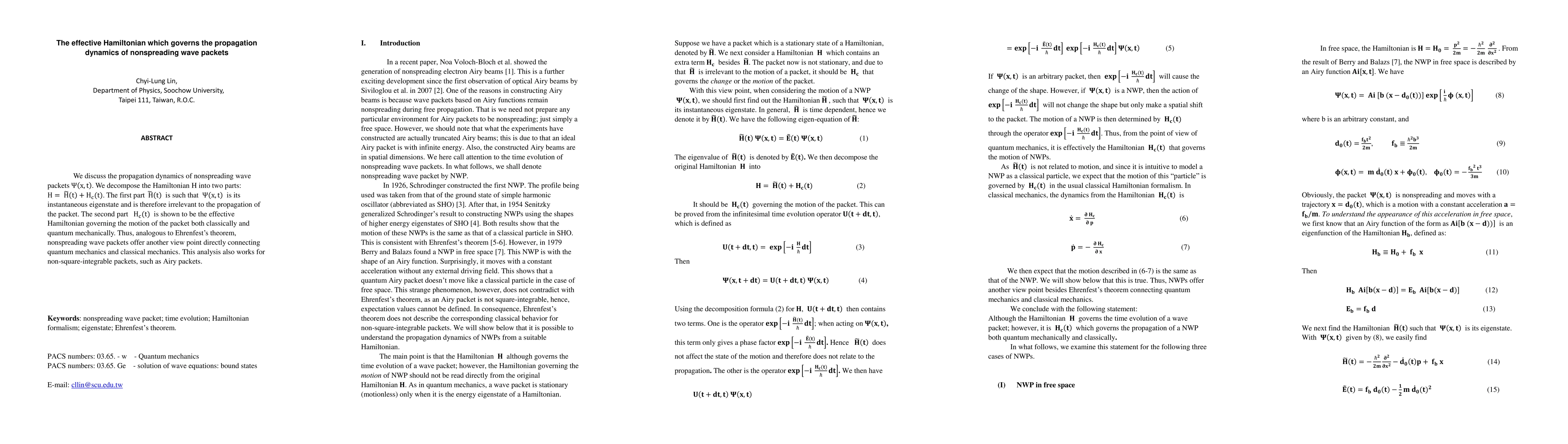 This paper decomposes the Hamiltonian into two parts to study the propagation dynamics of nonspreading wave packets. The second part is identified as the effective Hamiltonian governing the packet's motion, analogously linking quantum and classical mechanics, and extends to non-square-integrable packets like Airy packets.