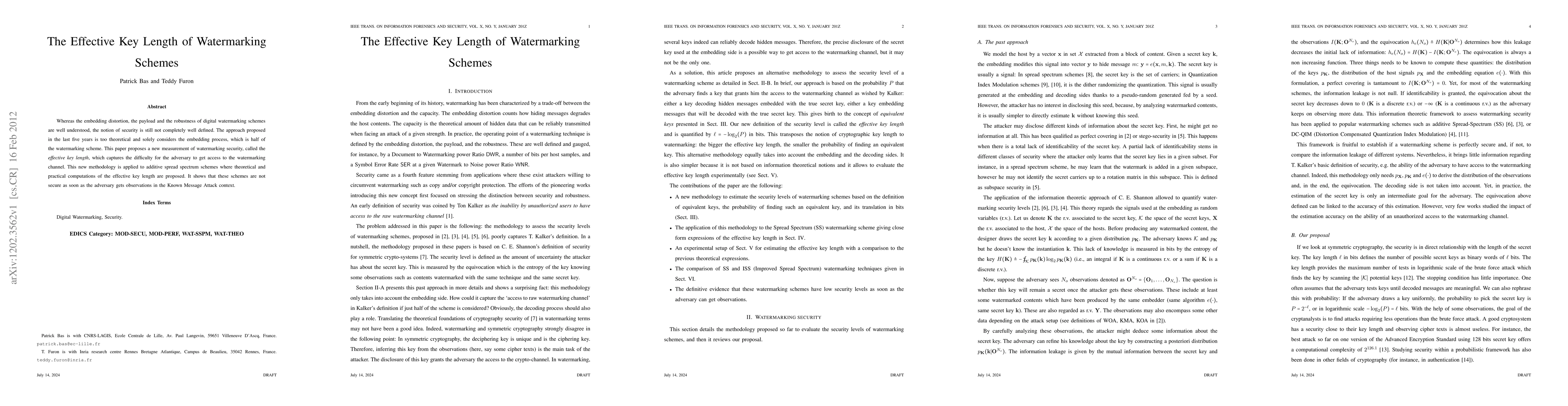 This paper introduces the concept of effective key length to measure the security of digital watermarking schemes, emphasizing the importance of considering the adversary's access to the watermarking channel. It applies this new metric to additive spread spectrum schemes, revealing their vulnerability in Known Message Attack scenarios.