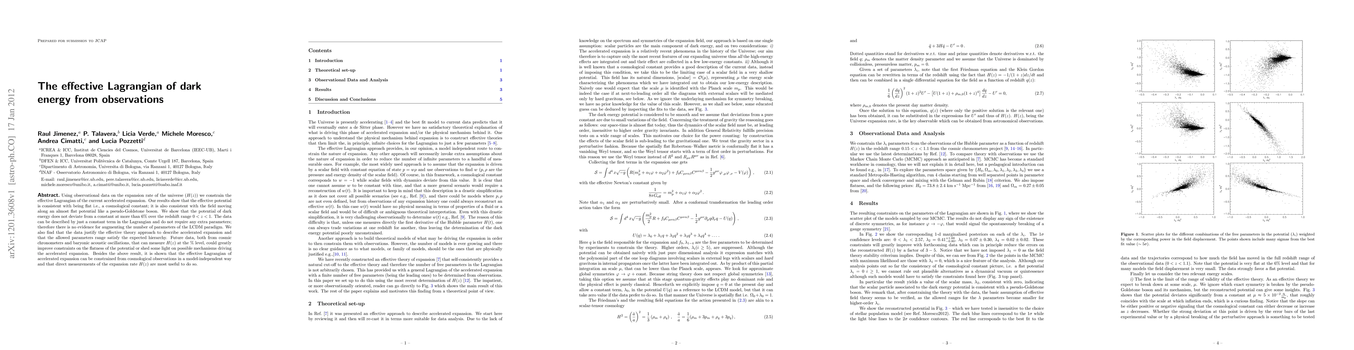 Using observational data on the expansion rate of the universe (H(z)) we constrain the effective Lagrangian of the current accelerated expansion. Our results show that the effective potential is consistent with being flat i.e., a cosmological constant; it is also consistent with the field moving along an almost flat potential like a pseudo-Goldstone boson. We show that the potential of dark energy does not deviate from a constant at more than 6% over the redshift range 0 < z < 1. The data can be described by just a constant term in the Lagrangian and do not require any extra parameters; therefore there is no evidence for augmenting the number of parameters of the LCDM paradigm. We also find that the data justify the effective theory approach to describe accelerated expansion and that the allowed parameters range satisfy the expected hierarchy. Future data, both from cosmic chronometers and baryonic acoustic oscillations, that can measure H(z) at the % level, could greatly improve constraints on the flatness of the potential or shed some light on possible mechanisms driving the accelerated expansion. Besides the above result, it is shown that the effective Lagrangian of accelerated expansion can be constrained from cosmological observations in a model-independent way and that direct measurements of the expansion rate H(z) are most useful to do so.