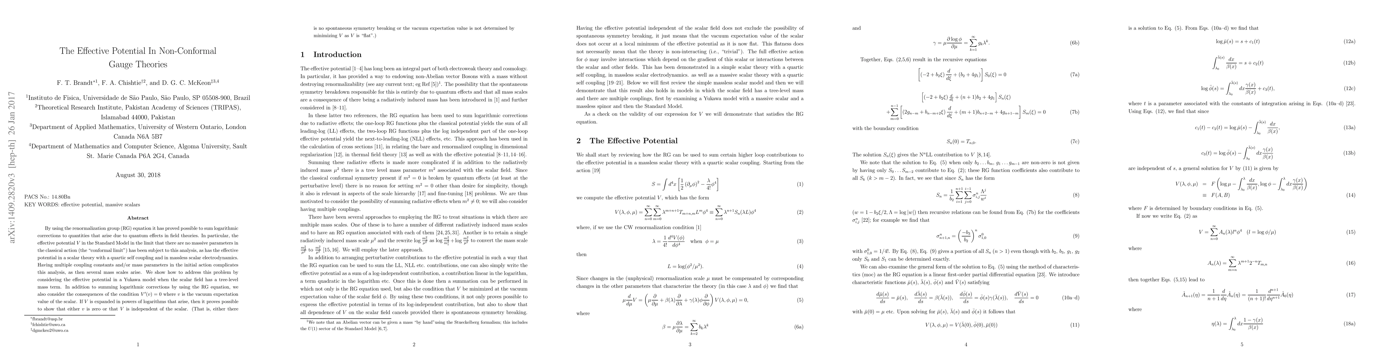 By using the renormalization group (RG) equation it has proved possible to sum logarithmic corrections to quantities that arise due to quantum effects in field theories. In particular, the effective potential V in the Standard Model in the limit that there are no massive parameters in the classical action (the "conformal limit") has been subject to this analysis, as has the effective potential in a scalar theory with a quartic self coupling and in massless scalar electrodynamics. Having multiple coupling constants and/or mass parameters in the initial action complicates this analysis, as then several mass scales arise. We show how to address this problem by considering the effective potential in scalar electrodynamics when the scalar field has a tree level mass term. In addition to summing logarithmic corrections by using the RG equation, we also consider the consequences of the condition V'(v)=0 where v is the vacuum expectation value of the scalar. If V is expanded in powers of the logarithms that arise, then it proves possible to show that either v is zero or that V is independent of the scalar. (That is, either there is no spontaneous symmetry breaking or the vacuum expectation value is not determined by minimizing V as V is "flat".)