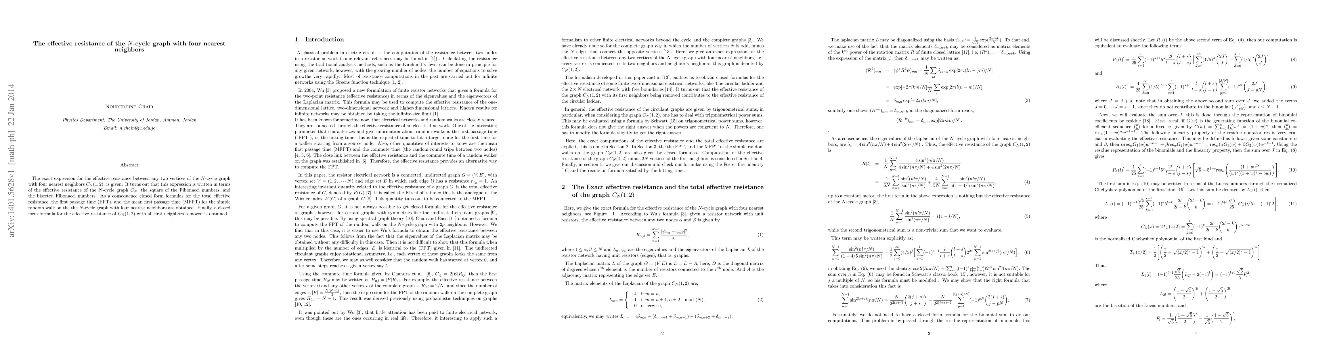 The exact expression for the effective resistance between any two vertices of the $N$-cycle graph with four nearest neighbors $C_{N}(1,2)$, is given. It turns out that this expression is written in terms of the effective resistance of the $N$-cycle graph $C_{N}$, the square of the Fibonacci numbers, and the bisected Fibonacci numbers. As a consequence closed form formulas for the total effective resistance, the first passage time (FPT), and the mean first passage time (MFPT) for the simple random walk on the the $N$-cycle graph with four nearest neighbors are obtained. Finally, a closed form formula for the effective resistance of $C_{N}(1,2)$ with all first neighbors removed is obtained.