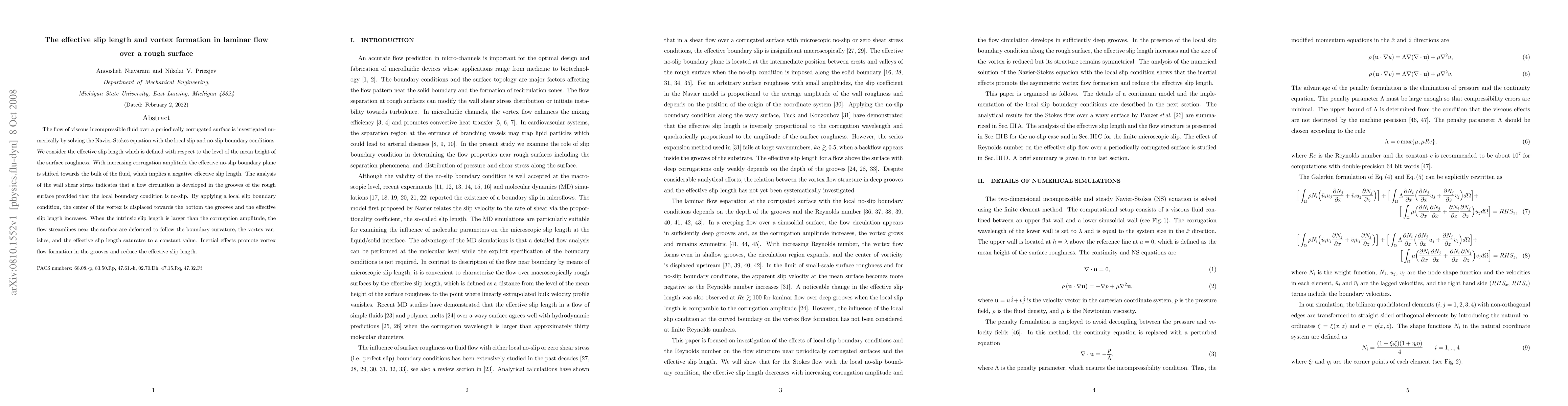 This paper numerically investigates the effect of surface roughness on fluid flow, finding that increased corrugation shifts the effective no-slip boundary plane, leading to a negative effective slip length. Vortex formation is observed in grooves under no-slip conditions, while local slip conditions displace vortex centers and increase the effective slip length.
