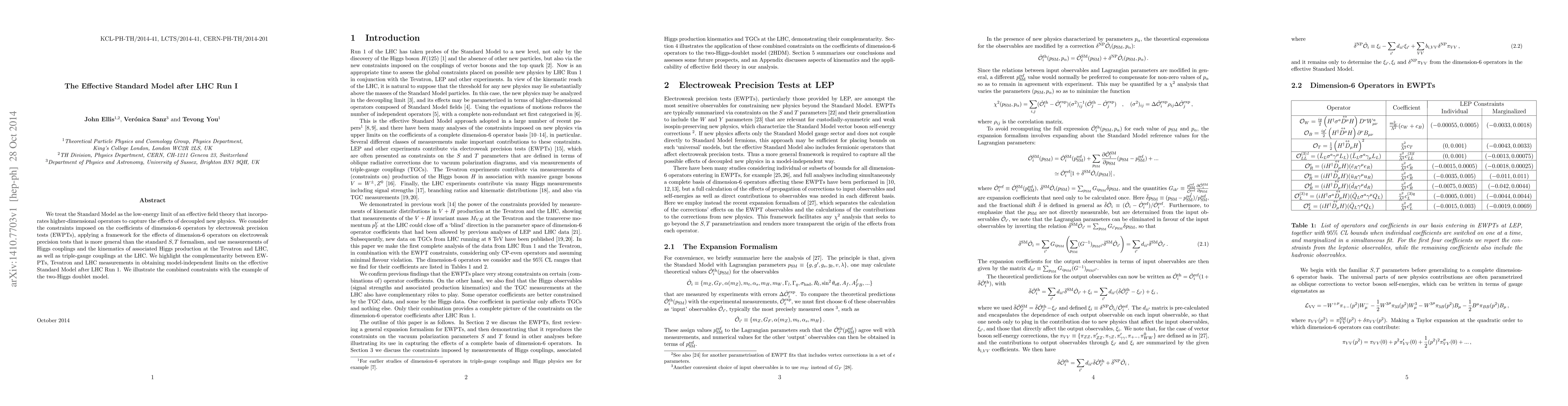 This paper examines the Standard Model as an effective field theory, incorporating higher-dimensional operators to account for new physics. It uses electroweak precision tests and LHC measurements to derive model-independent limits on the effective Standard Model post-LHC Run I, highlighting the synergy between various experimental data sources.