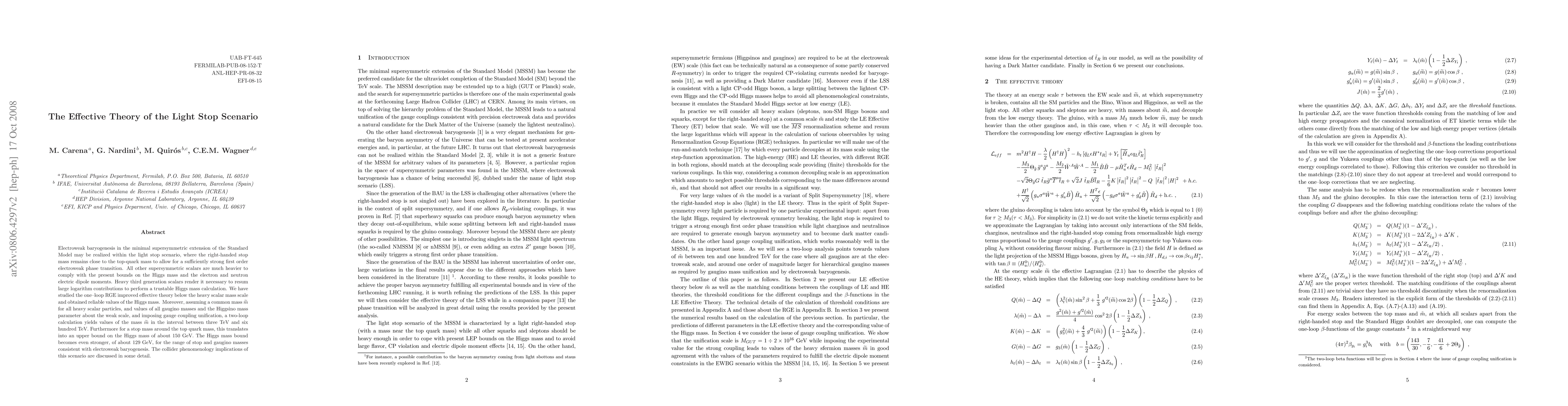 Electroweak baryogenesis in the minimal supersymmetric extension of the Standard Model may be realized within the light stop scenario, where the right-handed stop mass remains close to the top-quark mass to allow for a sufficiently strong first order electroweak phase transition. All other supersymmetric scalars are much heavier to comply with the present bounds on the Higgs mass and the electron and neutron electric dipole moments. Heavy third generation scalars render it necessary to resum large logarithm contributions to perform a trustable Higgs mass calculation. We have studied the one--loop RGE improved effective theory below the heavy scalar mass scale and obtained reliable values of the Higgs mass. Moreover, assuming a common mass $\tilde m$ for all heavy scalar particles, and values of all gaugino masses and the Higgsino mass parameter about the weak scale, and imposing gauge coupling unification, a two-loop calculation yields values of the mass $\tilde m$ in the interval between three TeV and six hundred TeV. Furthermore for a stop mass around the top quark mass, this translates into an upper bound on the Higgs mass of about 150 GeV. The Higgs mass bound becomes even stronger, of about 129 GeV, for the range of stop and gaugino masses consistent with electroweak baryogenesis. The collider phenomenology implications of this scenario are discussed in some detail.