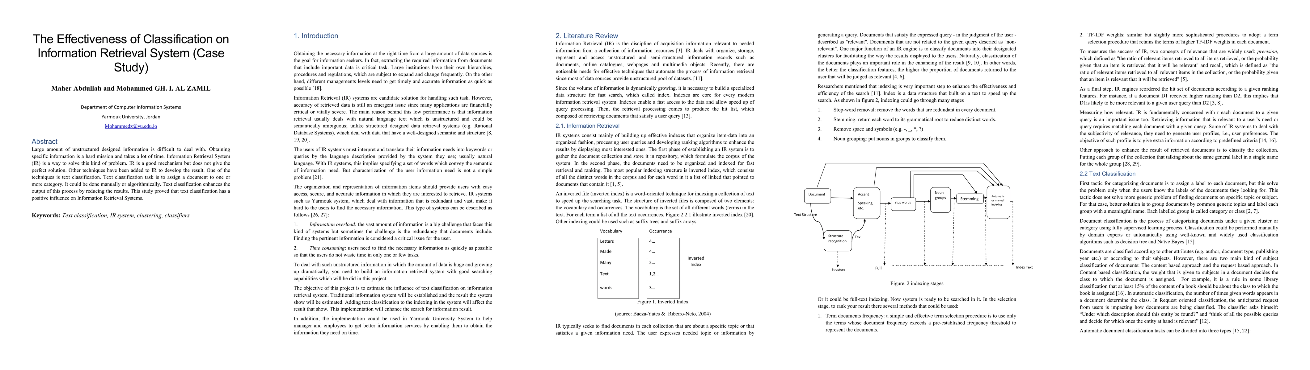 Large amount of unstructured designed information is difficult to deal with. Obtaining specific information is a hard mission and takes a lot of time. Information Retrieval System (IR) is a way to solve this kind of problem. IR is a good mechanism but does not give the perfect solution. Other techniques have been added to IR to develop the result. One of the techniques is text classification. Text classification task is to assign a document to one or more category. It could be done manually or algorithmically. Text classification enhances the output of this process by reducing the results. This study proved that text classification has a positive influence on Information Retrieval Systems.