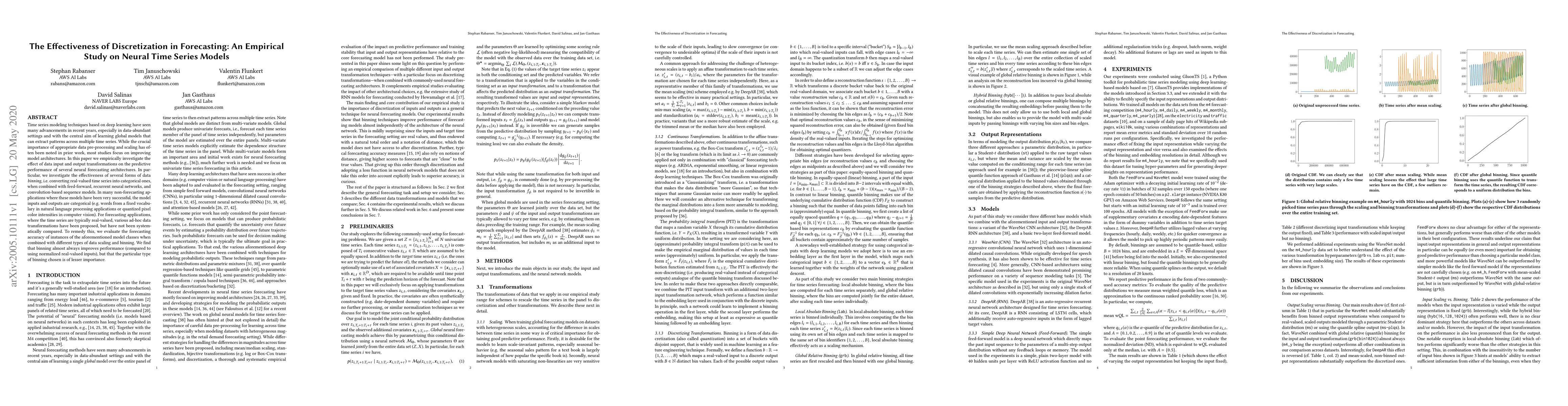Time series modeling techniques based on deep learning have seen many advancements in recent years, especially in data-abundant settings and with the central aim of learning global models that can extract patterns across multiple time series. While the crucial importance of appropriate data pre-processing and scaling has often been noted in prior work, most studies focus on improving model architectures. In this paper we empirically investigate the effect of data input and output transformations on the predictive performance of several neural forecasting architectures. In particular, we investigate the effectiveness of several forms of data binning, i.e. converting real-valued time series into categorical ones, when combined with feed-forward, recurrent neural networks, and convolution-based sequence models. In many non-forecasting applications where these models have been very successful, the model inputs and outputs are categorical (e.g. words from a fixed vocabulary in natural language processing applications or quantized pixel color intensities in computer vision). For forecasting applications, where the time series are typically real-valued, various ad-hoc data transformations have been proposed, but have not been systematically compared. To remedy this, we evaluate the forecasting accuracy of instances of the aforementioned model classes when combined with different types of data scaling and binning. We find that binning almost always improves performance (compared to using normalized real-valued inputs), but that the particular type of binning chosen is of lesser importance.