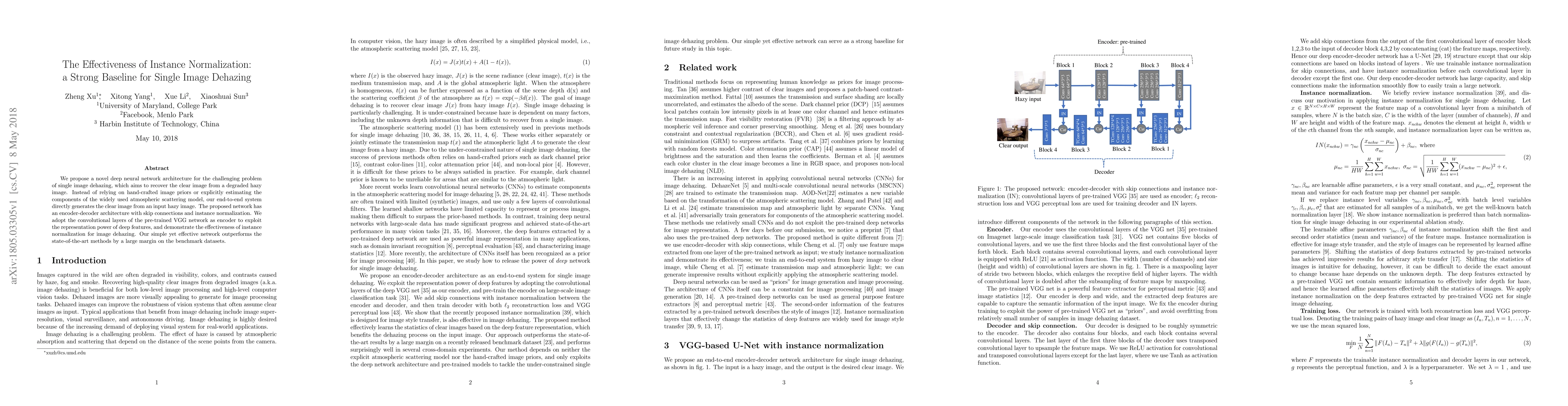 We propose a novel deep neural network architecture for the challenging problem of single image dehazing, which aims to recover the clear image from a degraded hazy image. Instead of relying on hand-crafted image priors or explicitly estimating the components of the widely used atmospheric scattering model, our end-to-end system directly generates the clear image from an input hazy image. The proposed network has an encoder-decoder architecture with skip connections and instance normalization. We adopt the convolutional layers of the pre-trained VGG network as encoder to exploit the representation power of deep features, and demonstrate the effectiveness of instance normalization for image dehazing. Our simple yet effective network outperforms the state-of-the-art methods by a large margin on the benchmark datasets.