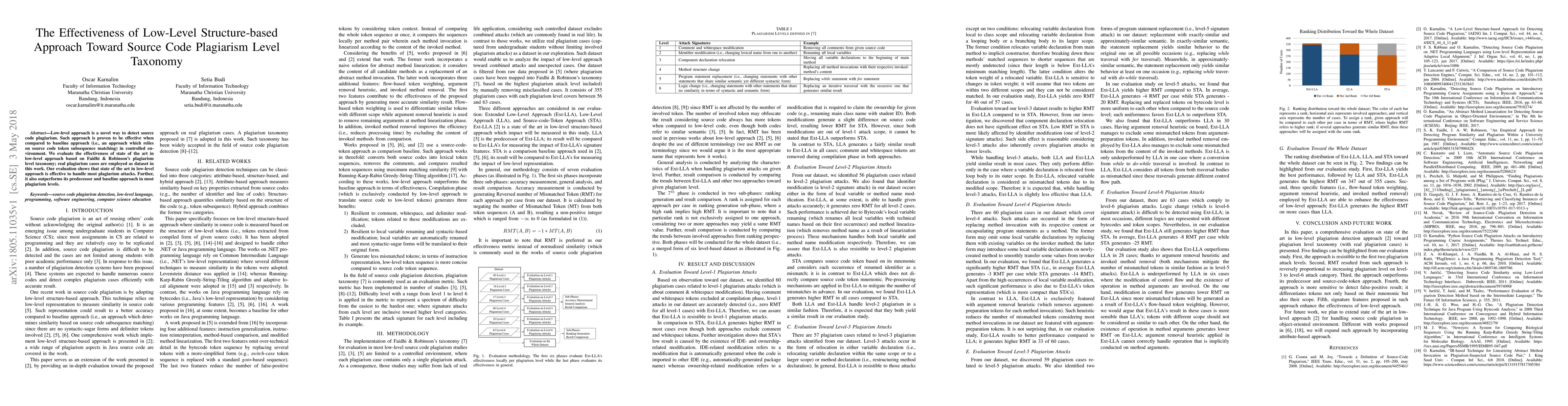 The novelty of this work lies in its comprehensive evaluation of the low-level structure-based approach using real plagiarism cases and its comparison with both its predecessor and a baseline token approach, demonstrating the superiority of the extended approach in handling multiple plagiarism attack levels.