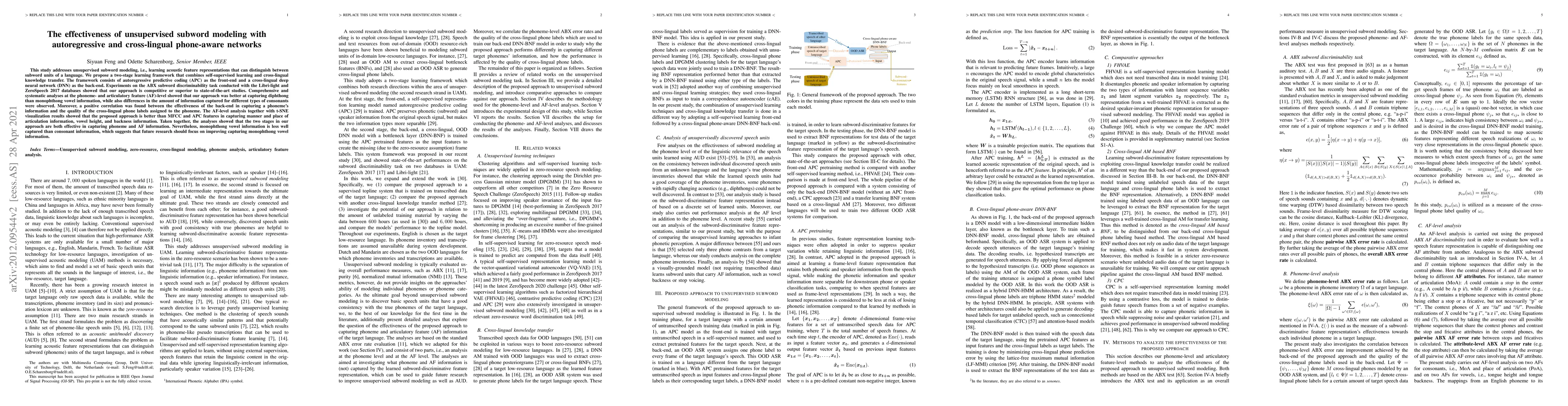 This study addresses unsupervised subword modeling, i.e., learning acoustic feature representations that can distinguish between subword units of a language. We propose a two-stage learning framework that combines self-supervised learning and cross-lingual knowledge transfer. The framework consists of autoregressive predictive coding (APC) as the front-end and a cross-lingual deep neural network (DNN) as the back-end. Experiments on the ABX subword discriminability task conducted with the Libri-light and ZeroSpeech 2017 databases showed that our approach is competitive or superior to state-of-the-art studies. Comprehensive and systematic analyses at the phoneme- and articulatory feature (AF)-level showed that our approach was better at capturing diphthong than monophthong vowel information, while also differences in the amount of information captured for different types of consonants were observed. Moreover, a positive correlation was found between the effectiveness of the back-end in capturing a phoneme's information and the quality of the cross-lingual phone labels assigned to the phoneme. The AF-level analysis together with t-SNE visualization results showed that the proposed approach is better than MFCC and APC features in capturing manner and place of articulation information, vowel height, and backness information. Taken together, the analyses showed that the two stages in our approach are both effective in capturing phoneme and AF information. Nevertheless, monophthong vowel information is less well captured than consonant information, which suggests that future research should focus on improving capturing monophthong vowel information.